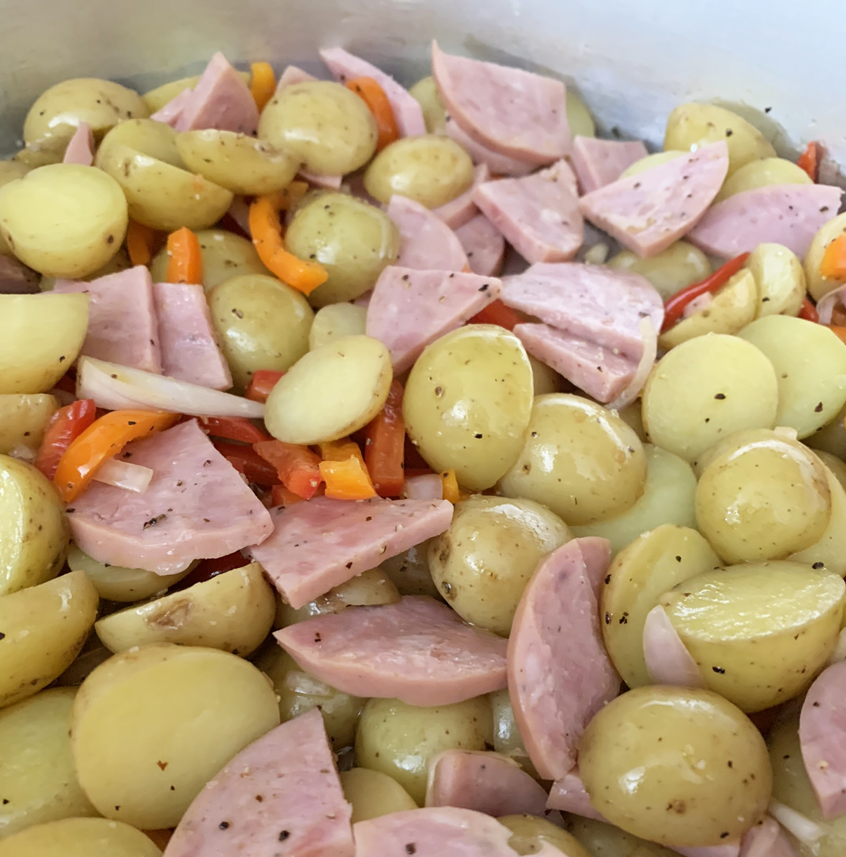 In a pan, heat the oil and add the sliced peppers and onion. Cook until the onion is caramelized and the peppers slightly softened (approximately 5 minutes). Season with paprika, salt, and pepper, and toss with the parboiled potatoes. Add the quartered kielbasa. Place in the prepared baking dish.