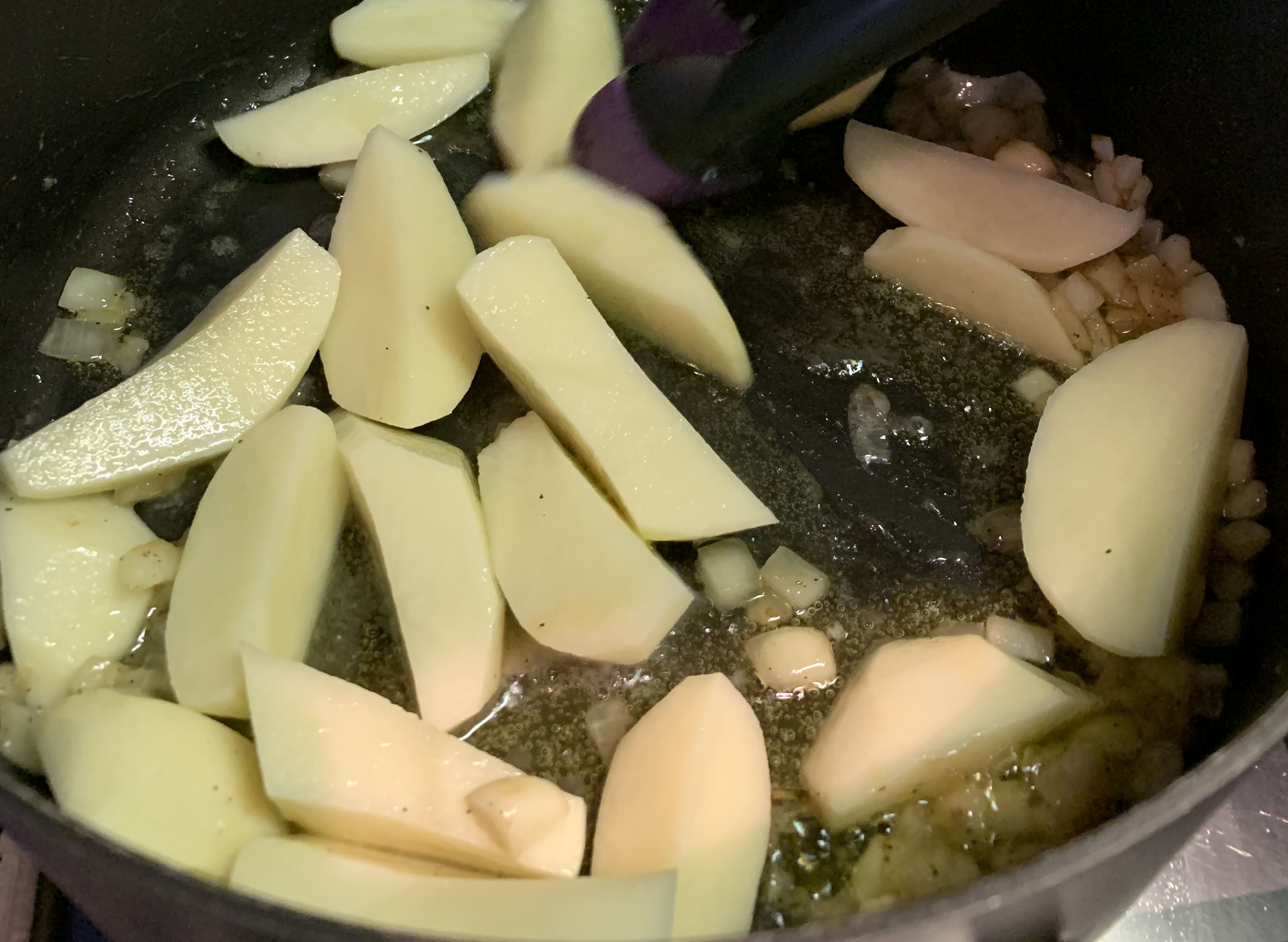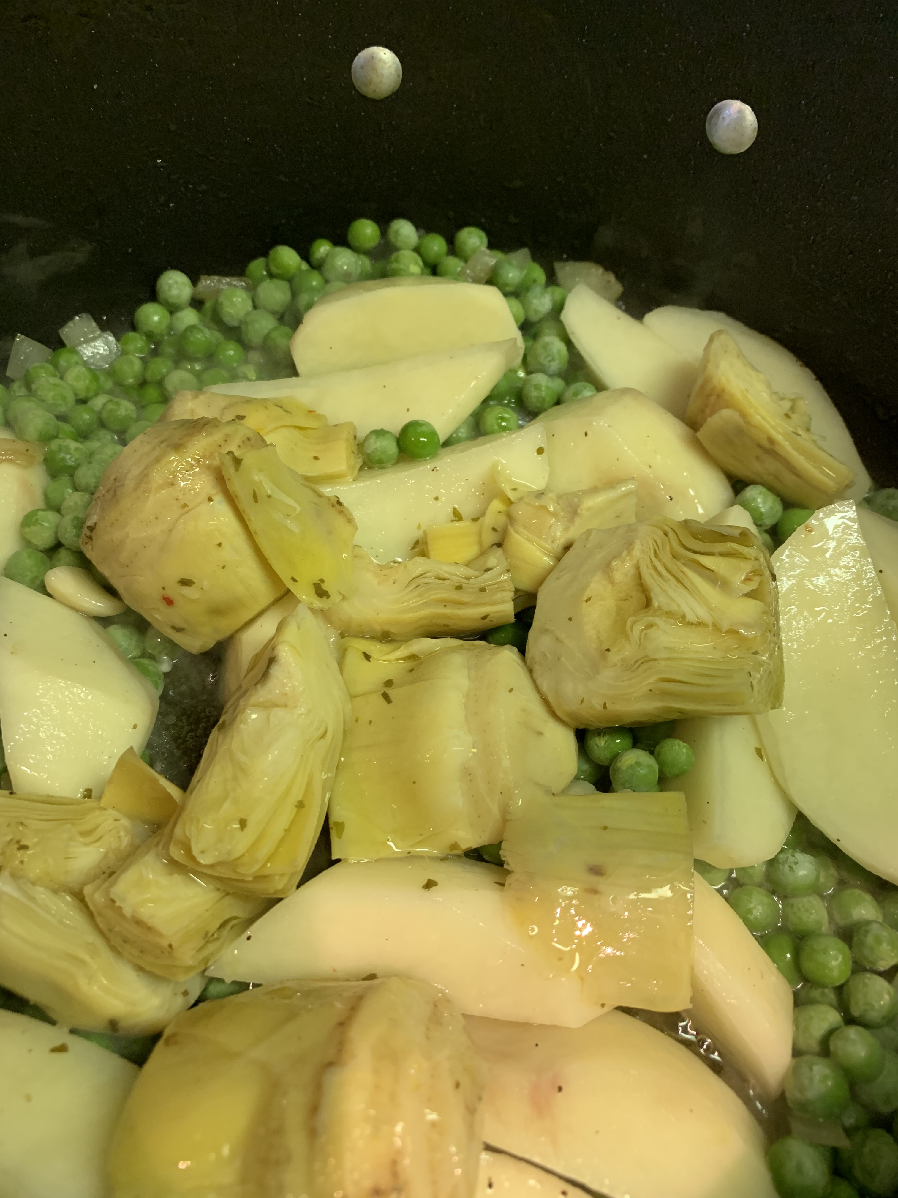 Heat the oil in a pot and add the meat and onions. Cook until meat is browned on both sides. Remove the meat and set it aside. Add the peas and potatoes to the pot and cook for 5 minutes. Add the artichoke hearts and garlic and cook for an additional 2 minutes. Season with salt and pepper.