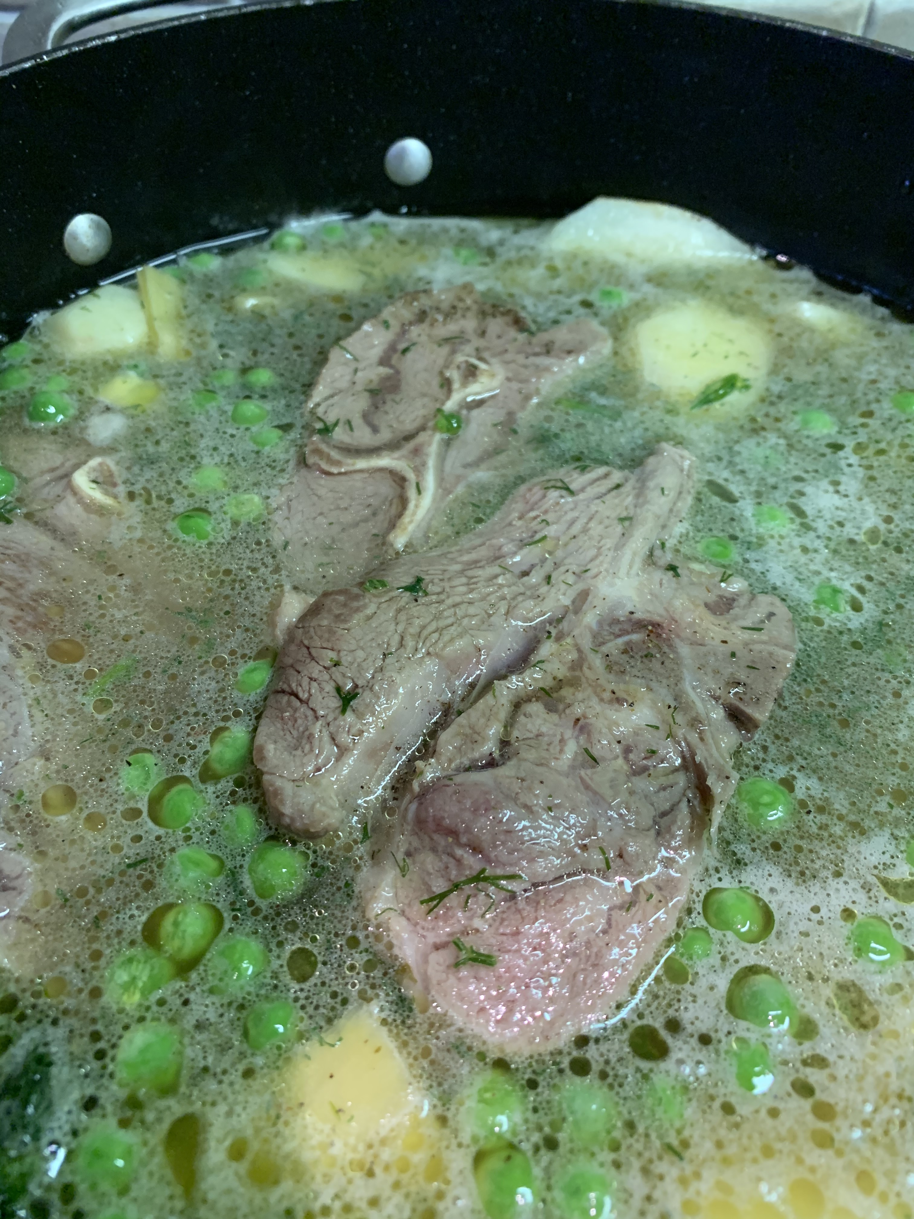 This stew-like dish is flavored with delicious sweet peas, artichoke hearts, and potatoes in a lemon sauce. Made with either lamb or veal chops, it is a hearty and easy to make dish that will satisfy all.