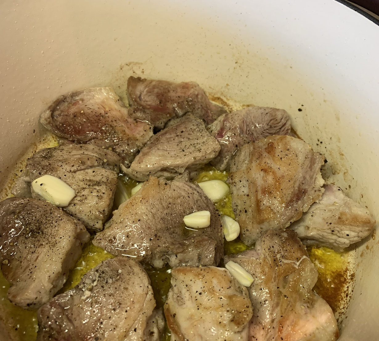 Heat the oil in a cast-iron pot and sear the pieces for 2 to 3 minutes per side. You may need to sear them in batches if they don’t all fit in your pot. Once the meat has been seared, add the garlic and the liquid. Note: the meat should be fully immersed.