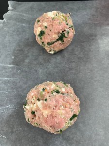 Add the turkey in a bowl big enough to mix. Add the oil to a pan and brown the onion and garlic. Add to the turkey. Using a sieve, remove any liquid from the frozen spinach and add to the turkey. Add spices, egg and crumbled feta. Mix the burger mixture by hand until well blended.