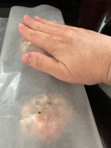Wash your hands and lightly grease them. Cut 8 sheets of wax paper approximately 8” long. Form the burger mix into 3” balls onto a sheet of wax paper. Place two burgers per sheet of wax paper. Once done, wash your hands. Fold over the wax paper and using your hands press down on the balls to make the burgers approximately 1” thick.