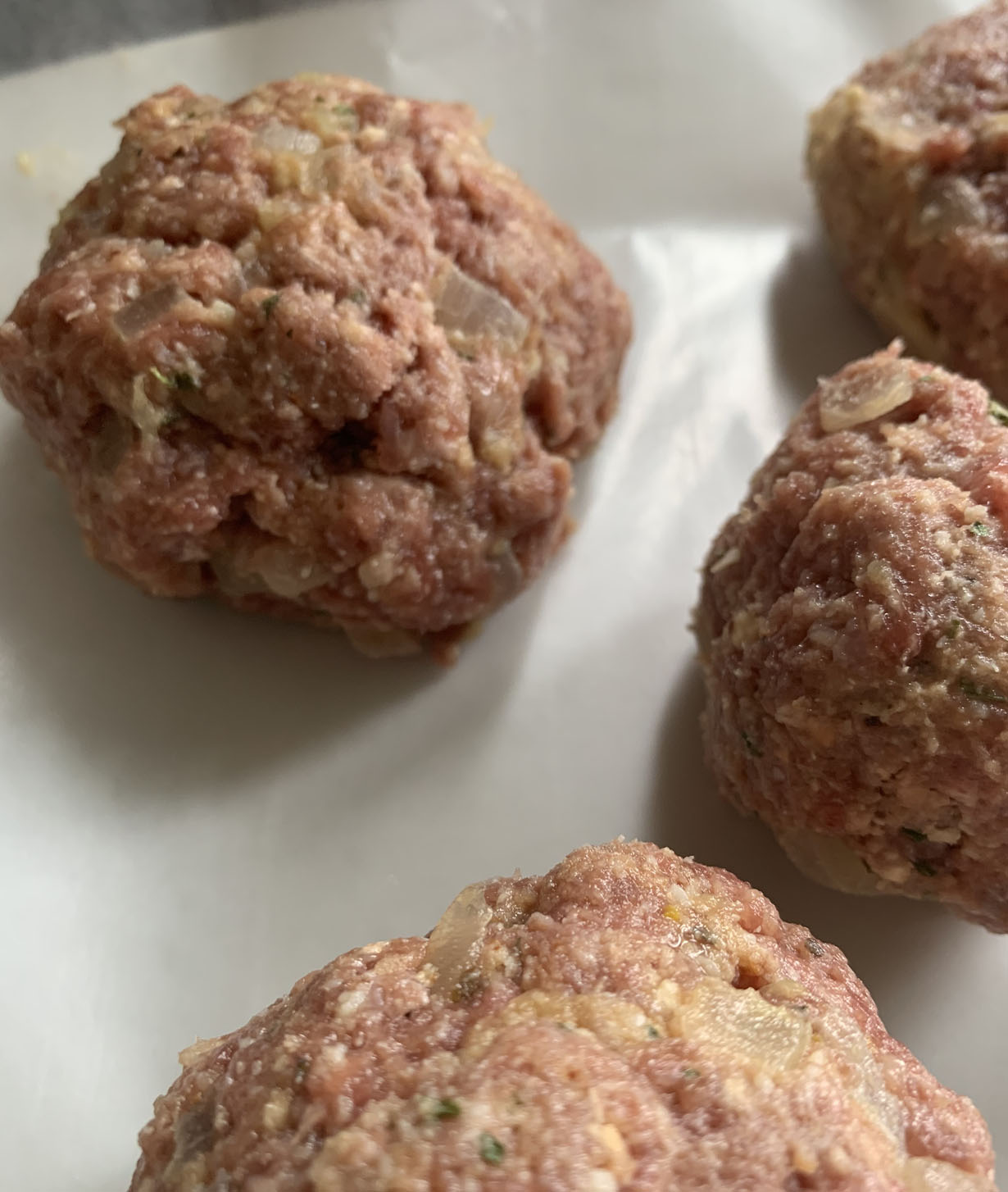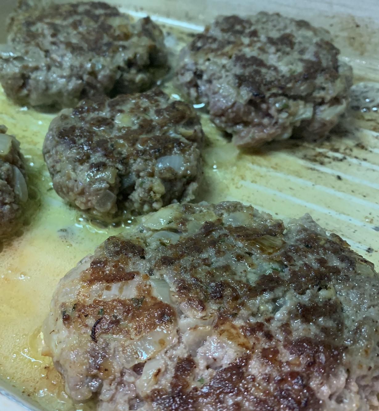 Heat a frying pan for a few minutes and then add the oil. Add the onion, mustard powder, oregano and garlic and cook until the onion is translucent (approximately 3 minutes). In a mixing bowl add the ground beef, cooked onion mix, bread crumbs, mustard, salt, Parmesan cheese and egg. Mix together well. Form 4” balls with your hands and place on a wax paper lined tray. Place a sheet of wax paper on top of the balls and with the back of a spatula, press down to form patties.