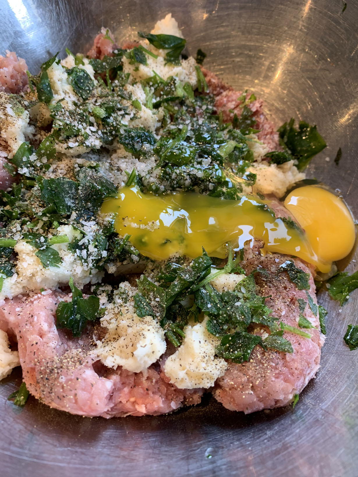 Add the 2 tablespoons of the olive oil to a small pan and heat. Add the onion and soften until translucent (approximately 3 minutes). Set aside. Trim the outside edges from the sliced bread and place the center pieces in 1/4 cup of milk to soak. Squeeze out the liquid as much as possible and then crumble the soaked bread into the ground meat. Add the diced mint, parsley, salt, pepper, cooked onion with the oil, and egg and mix together.