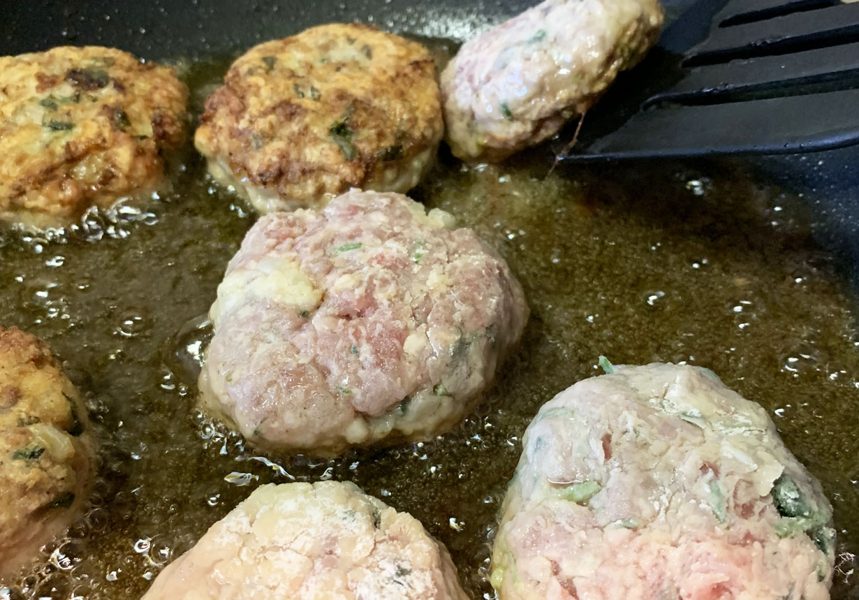 Wet your hands with a bit of water and take out 2 heaping tablespoons of the meat mixture into your palms. Rub the mixture to create a 3” ball. Slightly press together to flatten. Place the flattened keftetha onto flour. Cover with flour on both sides and set aside. Repeat until all the keftethes are made.