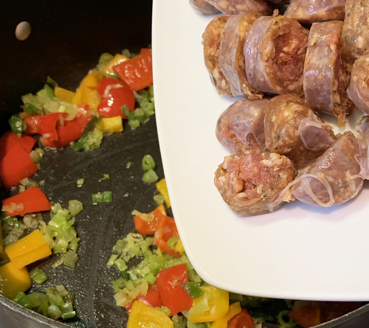 Jambalaya was invented in New Orleans and is a distant cousin to paella. Because saffron was so expensive, they used added tomatoes for flavor. Cumin is added into this version to add a bit of a Mediterranean flavor. The shrimp is pan fried in butter separately to add its own distinct touch to the dish.