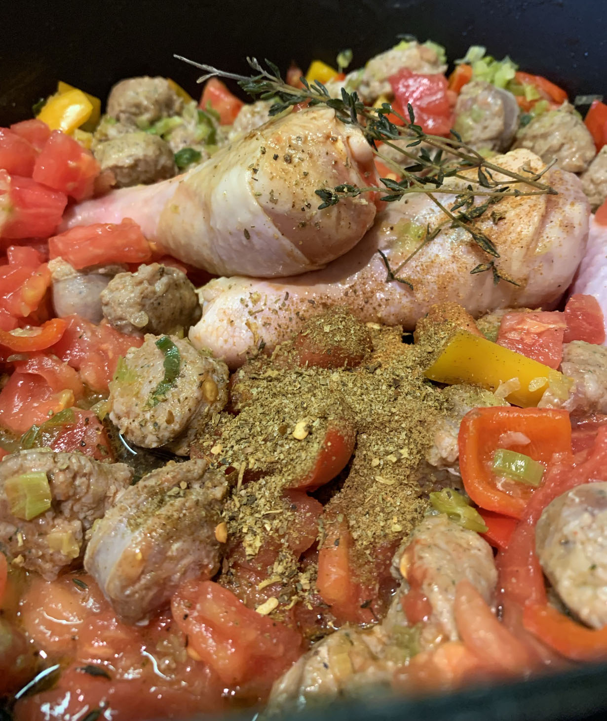 Heat 2 tablespoons of the oil in a pot and add the chopped pepper, celery, scallions, and salt. Cook for 3 minutes until tender. Add the sliced sausage and cook until browned (about 10 minutes). Add the chopped tomatoes and chicken legs and cook for a few more minutes until the chicken skin starts to brown (the chicken and sausages will not be fully cooked). Add the Cajun seasoning, cumin, Worcestershire sauce, thyme, and cayenne pepper and stir to coat the chicken and sausage. Add the chicken broth and bay leaves and reduce heat to a simmer. Cover and cook for approximately 1 hour, or until the stock has been reduced by half.