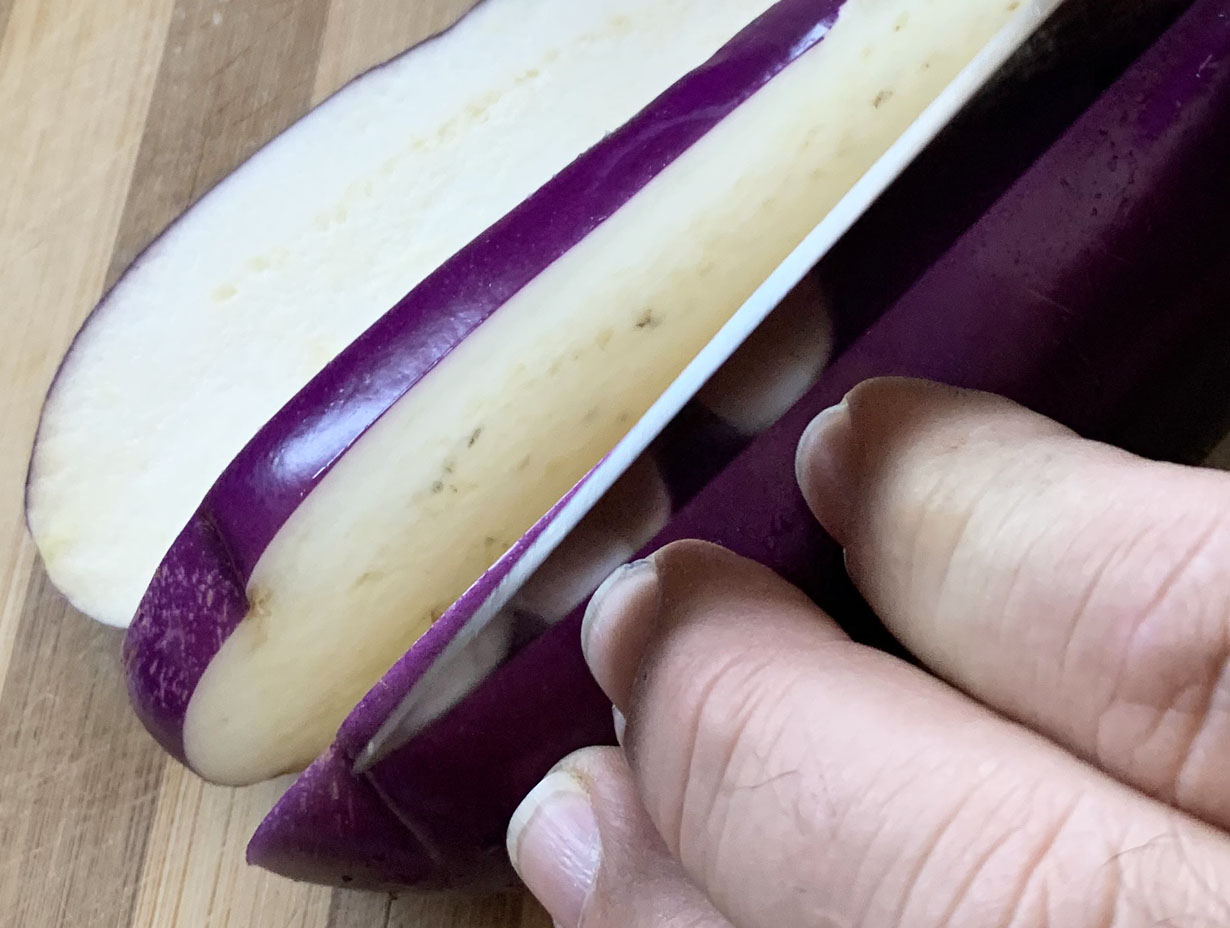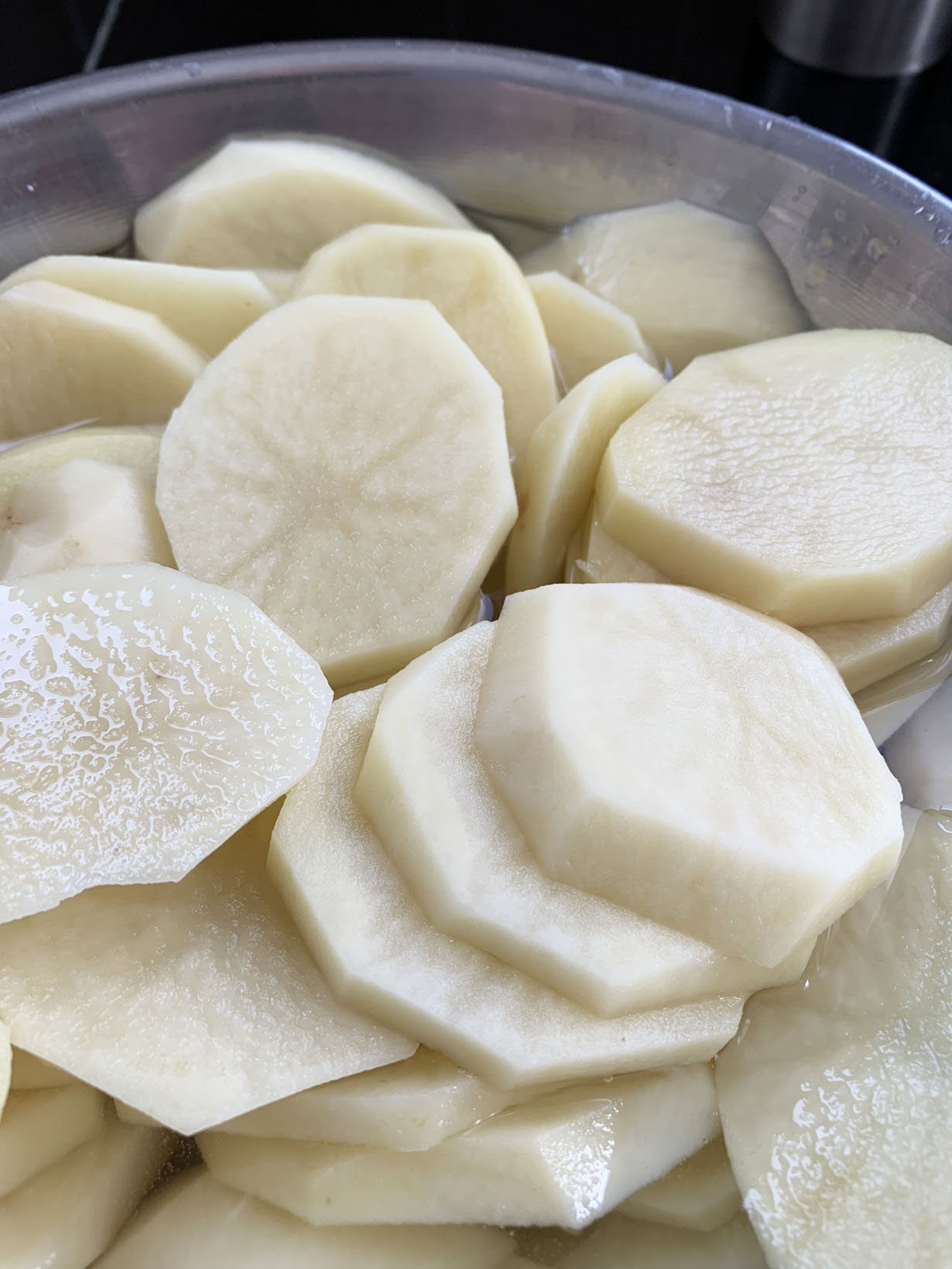 Preheat oven to 350 degrees Fahrenheit. Slice the eggplants and brush both sides with olive oil. Place on pan and bake for 45 minutes or until golden brown. Slice the potatoes into 1/4” thickness and rest in water. Heat frying oil and fry potato slices until crispy and brown. Set aside for assembly.