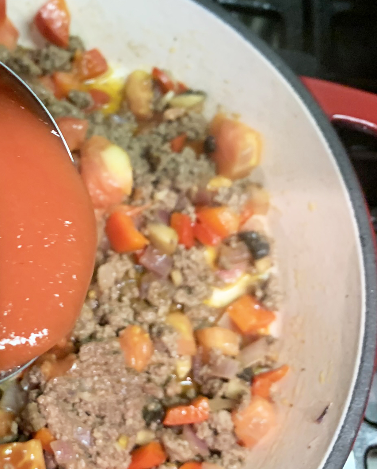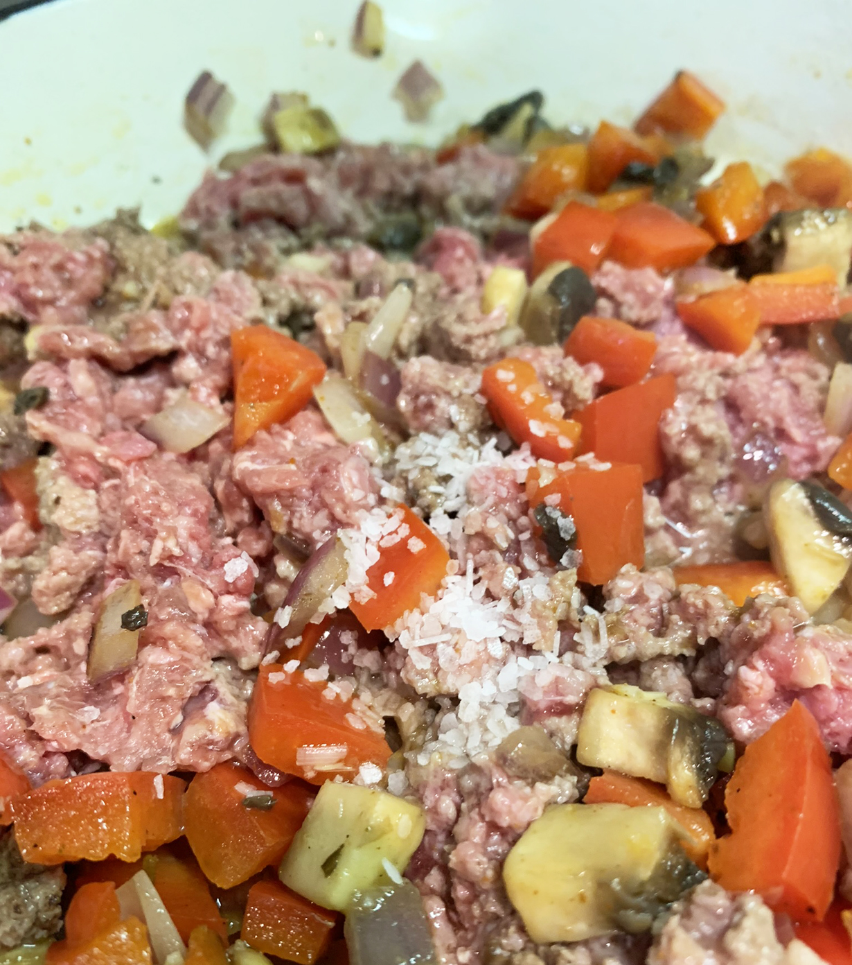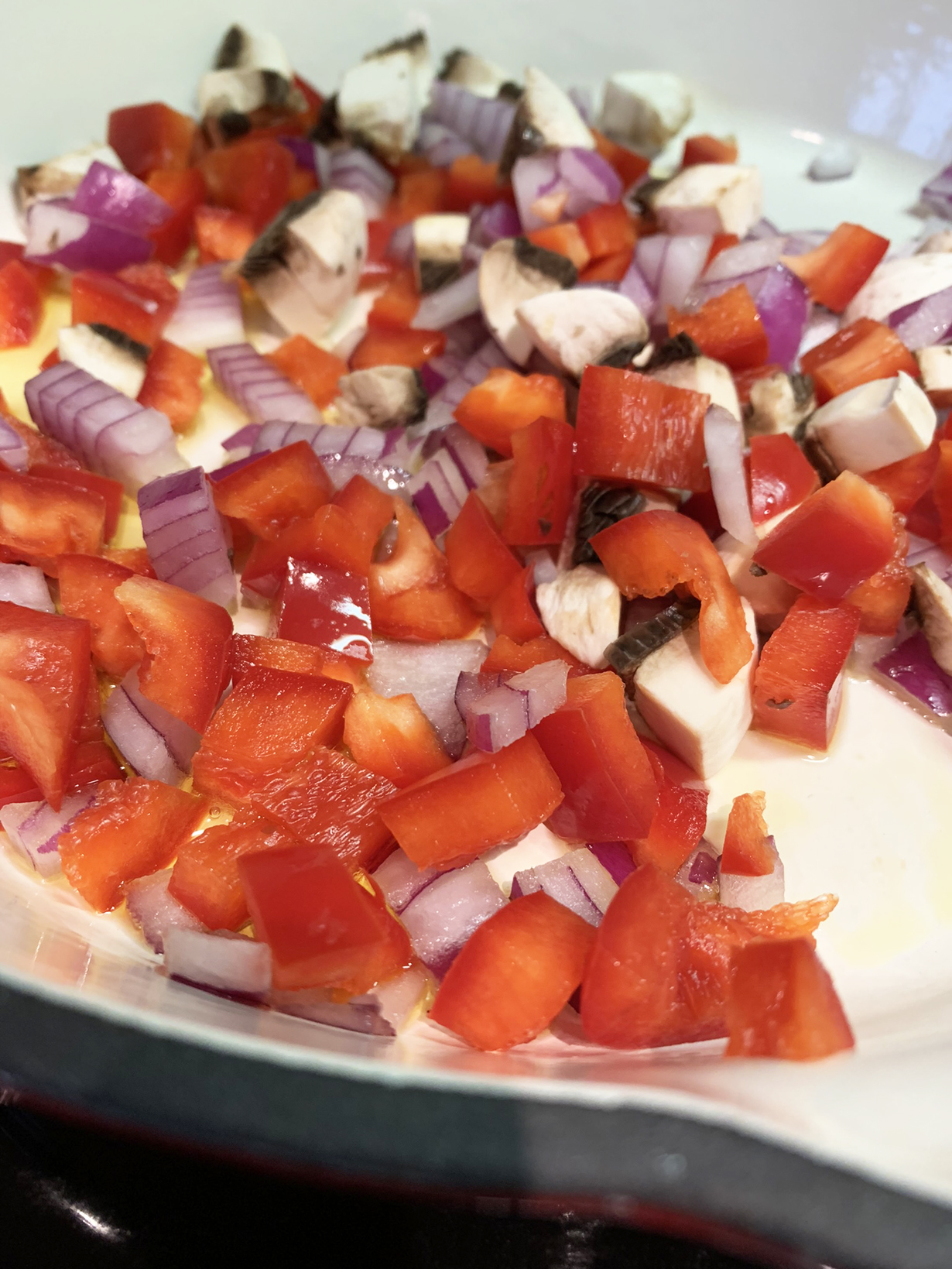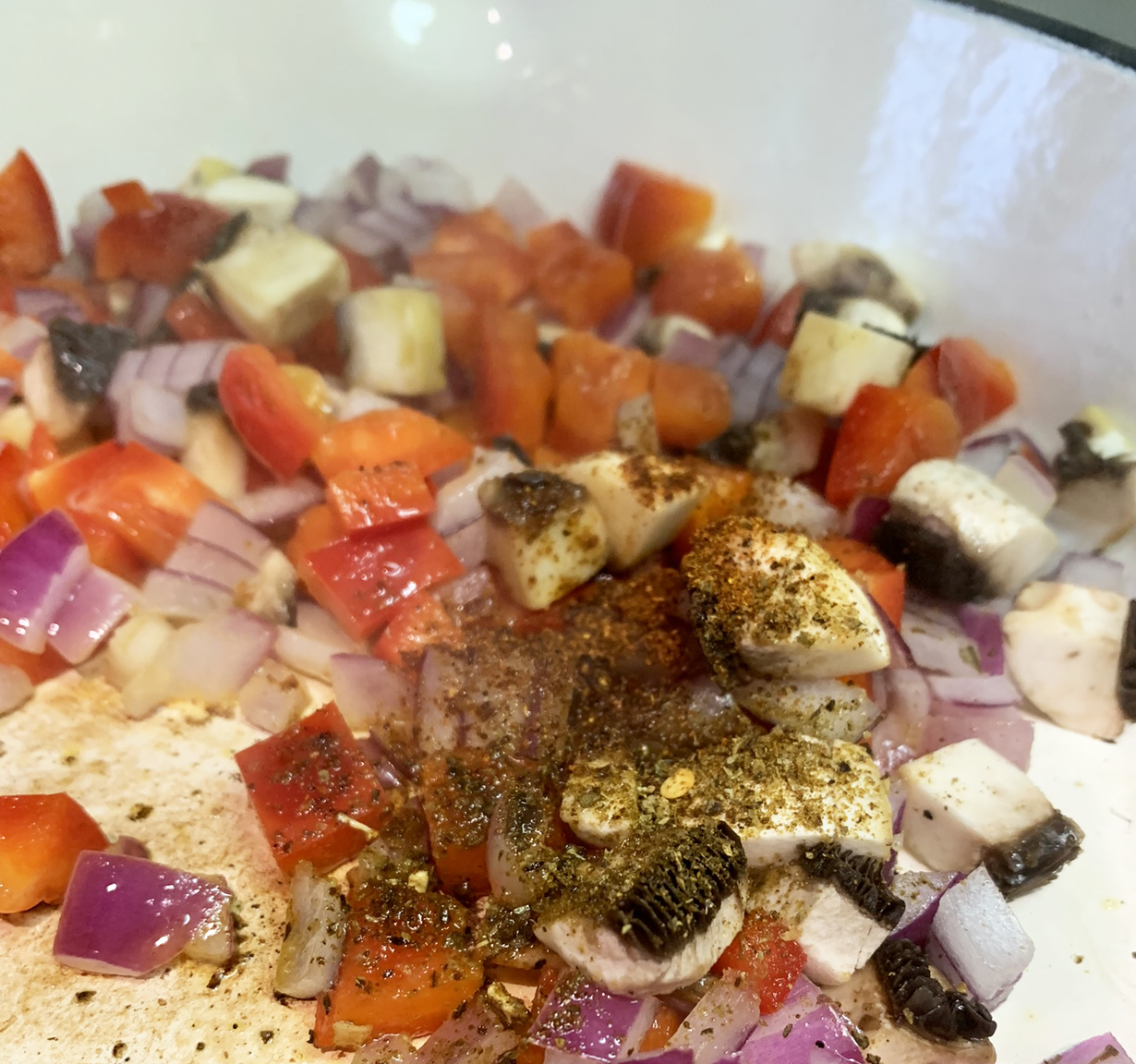 Preheat the oven to 350°F. In a cast-iron non-stick skillet, heat the oil over medium-high heat. Add the chopped red pepper, onion, and mushrooms and cook until the onion is translucent (approximately 5 minutes.) Add the ground beef and seasonings and cook, stirring often, for about 8 minutes. Add the chopped tomato and cook for an additional 5 minutes.