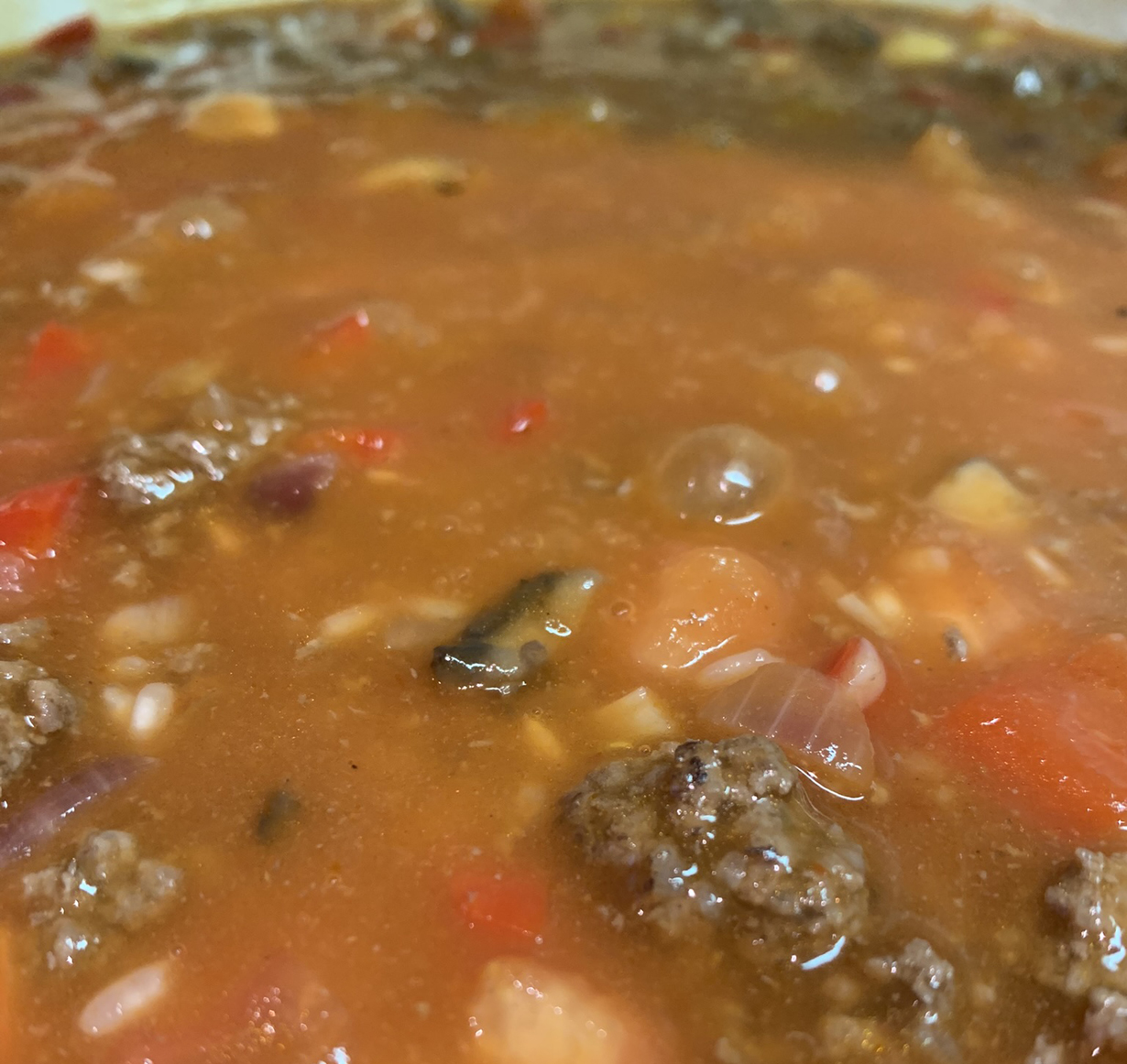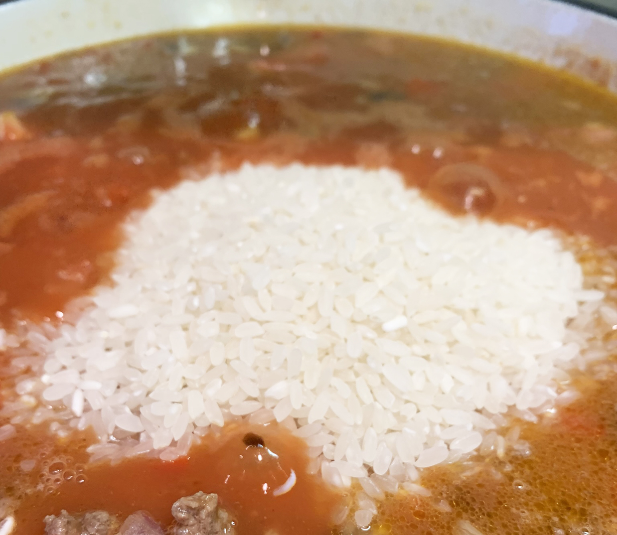 Add the tomato soup, water, and rice and stir together. Stir continuously to avoid the rice sticking to the bottom of the pan. Cook over low heat until all the moisture is absorbed and the rice is cooked. If needed, add more water. The rice should take no longer than 20 minutes to cook.
