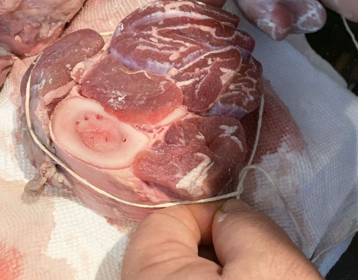 Pat dry the veal shanks with paper towels and tie them with kitchen string (this will ensure the meat does not fall apart while cooking.) Season the dried veal shanks with salt and pepper and dredge in flour. Set them aside.