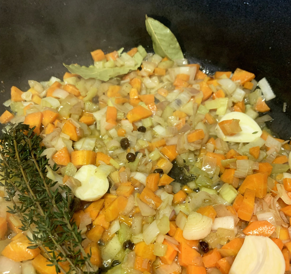 Melt the butter with the oil in a large dutch oven. Brown half of the shanks (do not overcrowd them) over high heat on all sides. Once browned, remove them from the pot. Add the chopped shallots, leek, carrots, and celery to the pot. Cook the vegetables until translucent (about 5 minutes), scraping the bottom to pick up any brown bits from the meat. Add the garlic, thyme, juniper berries, and bay leaves. Cook for an additional 2 minutes.