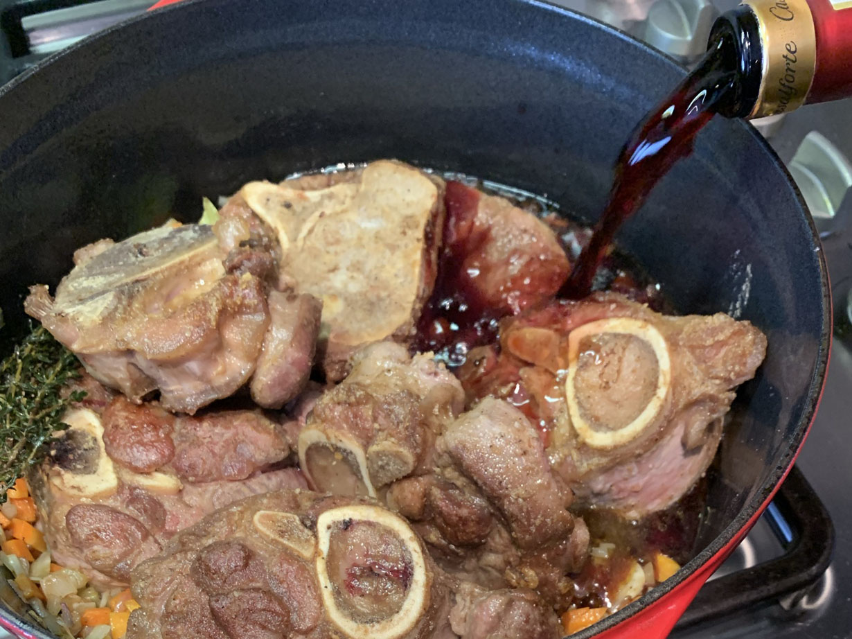 Place the shanks back into the dutch oven and add the bottle of wine. Turn the heat to low and simmer until the wine reduces by half (approximately 20 minutes). Season with salt and pepper. Once the wine has reduced, add the stock and the sauce. (*Alternatively, use 1 28-oz can of chopped plum tomatoes.) Cover the pot and bring the liquid to a boil. While you are waiting for the liquid to boil, preheat your oven to 350°F. Transfer to the preheated oven and cook covered for 2 hours.