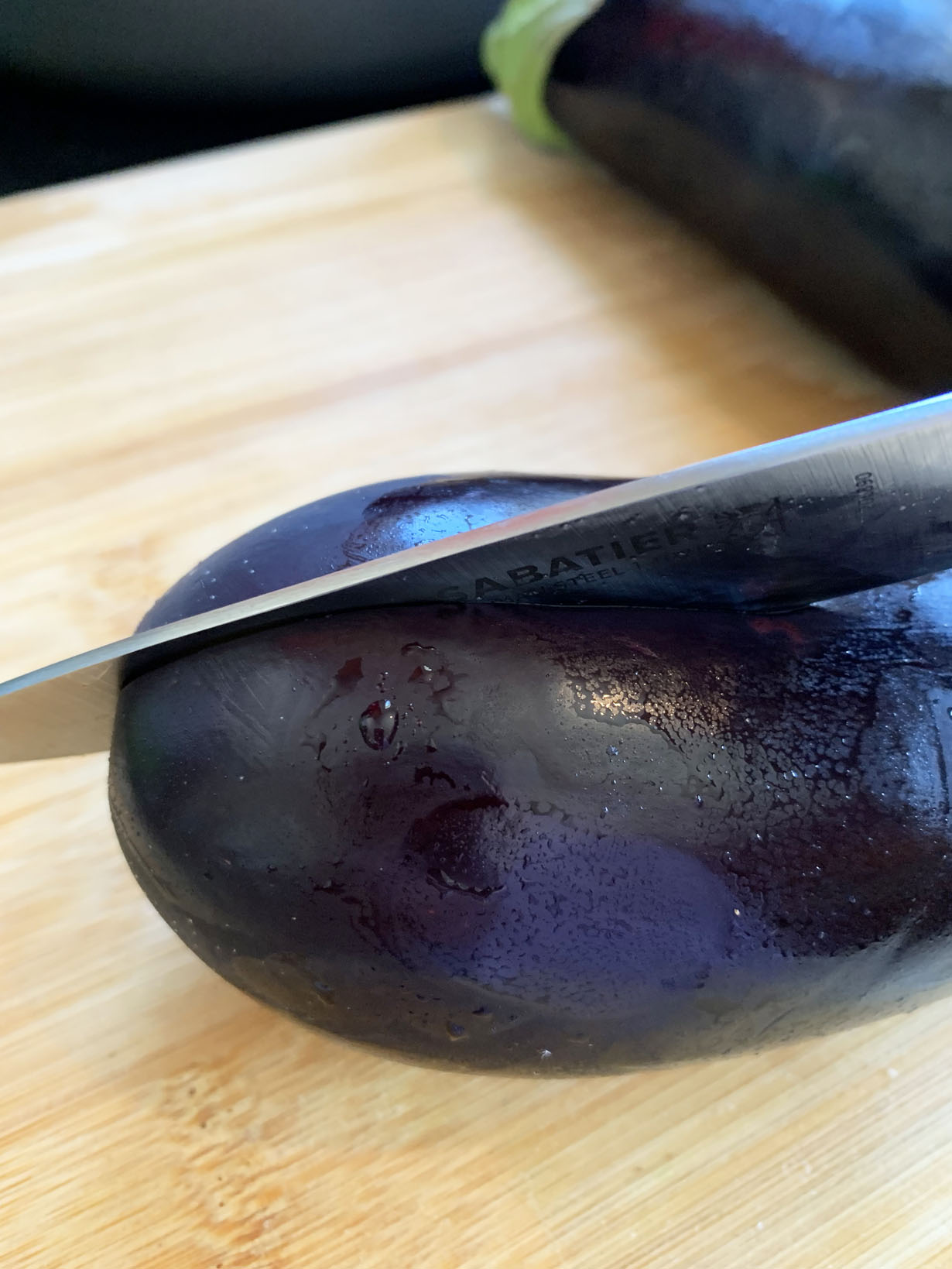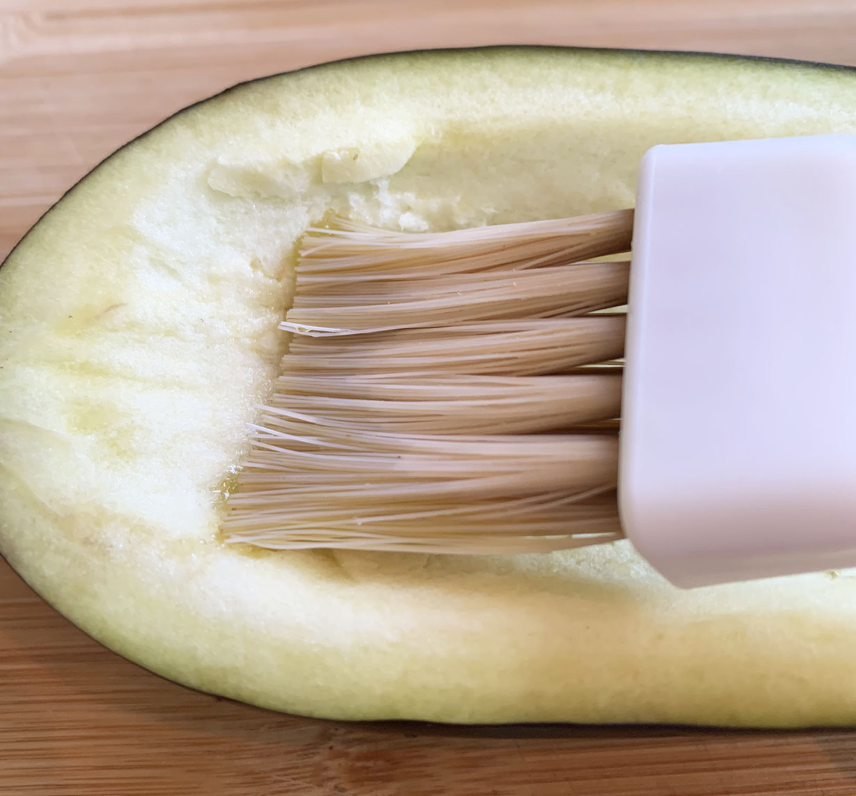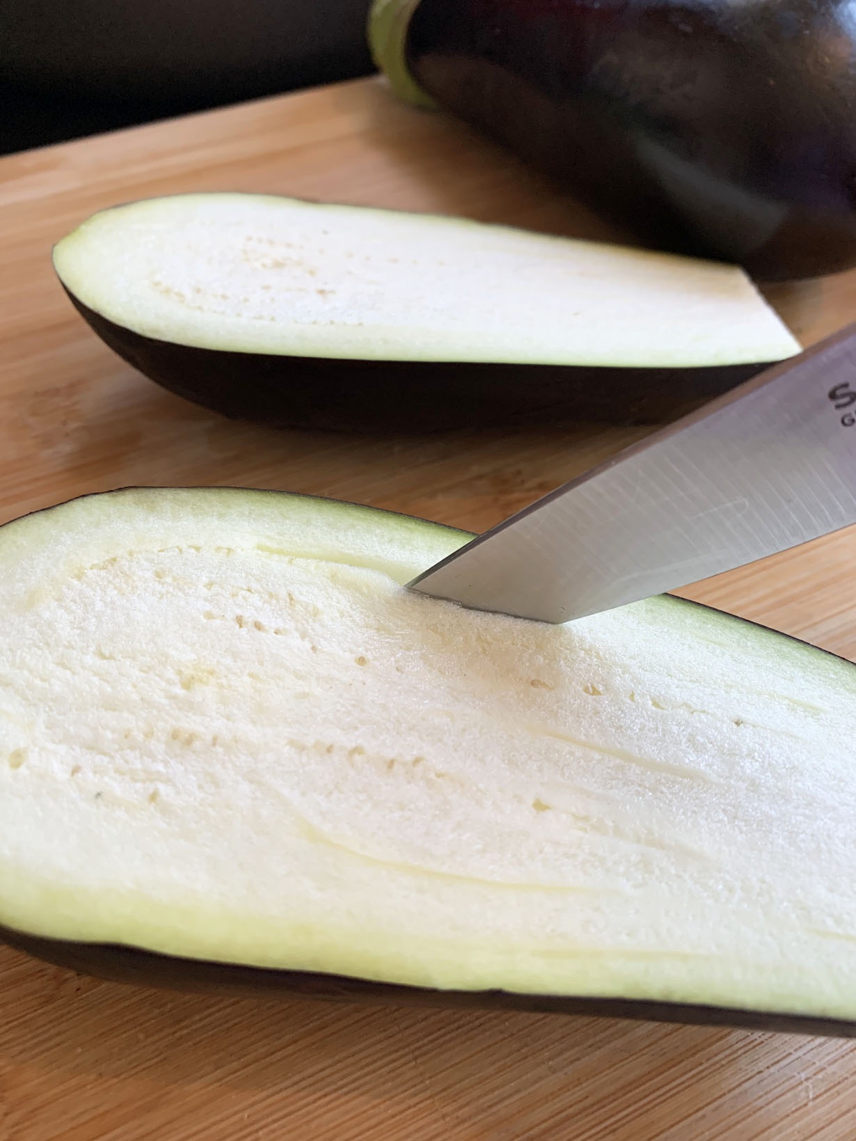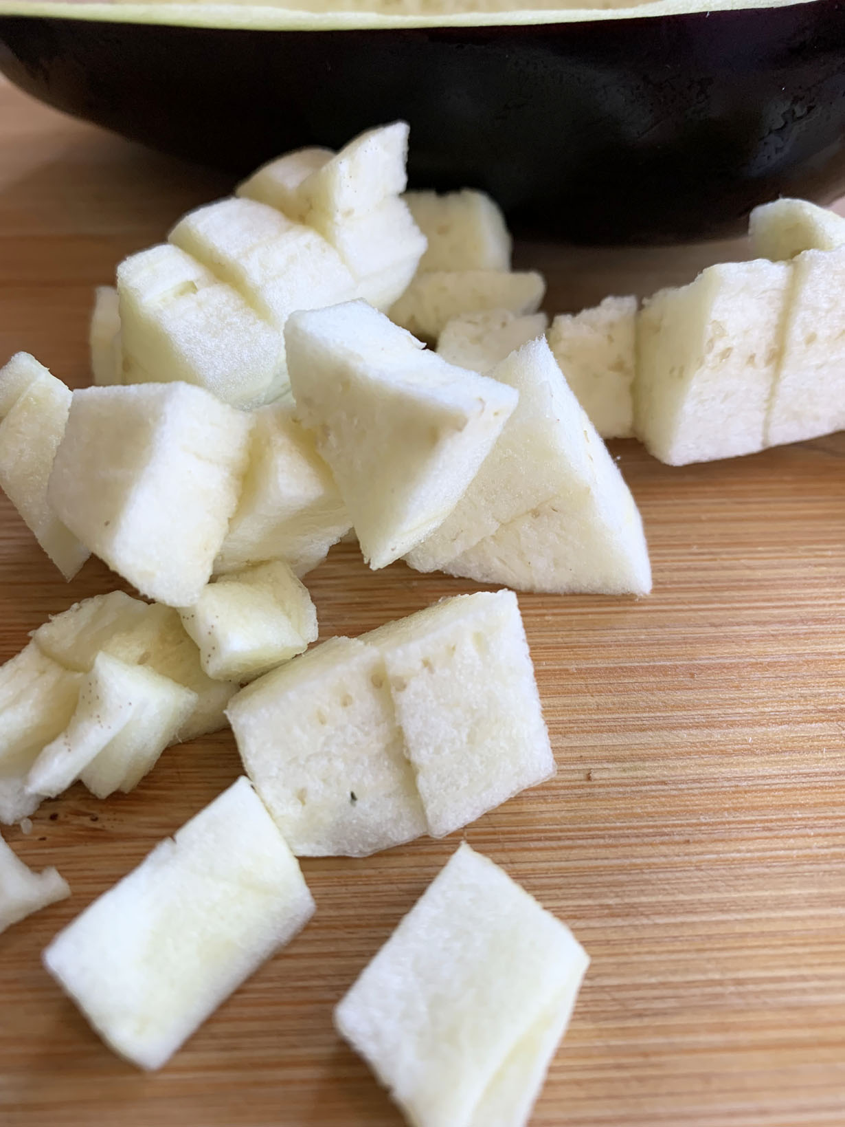 Slice and discard the ends of the eggplants and cut the eggplants in half with the eggplant curve facing up towards you. Remove the flesh from the eggplants by cutting around the rim. Slice the flesh into strips and then chop. Brush the inside of the eggplant with a little olive oil to prevent discoloration.