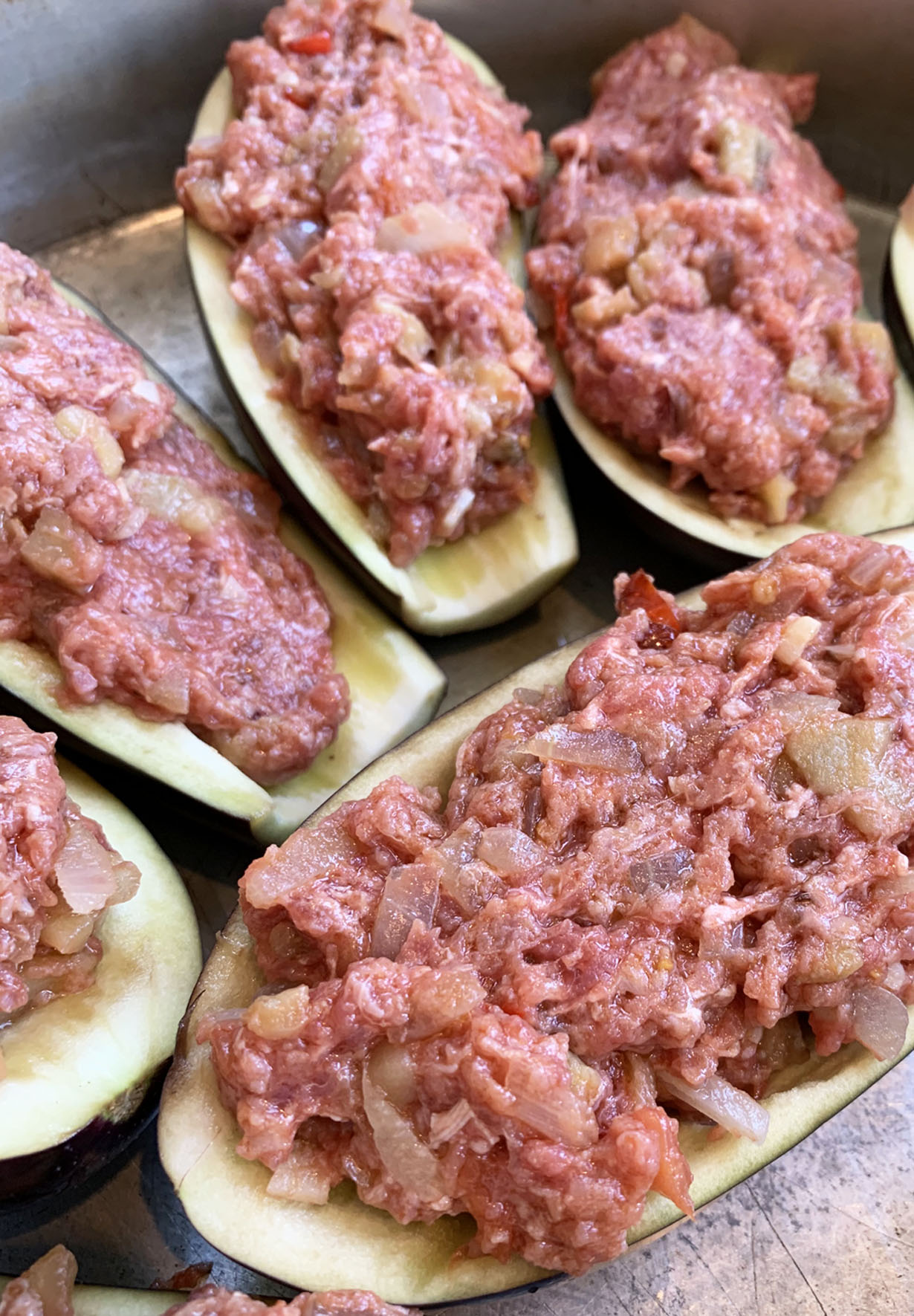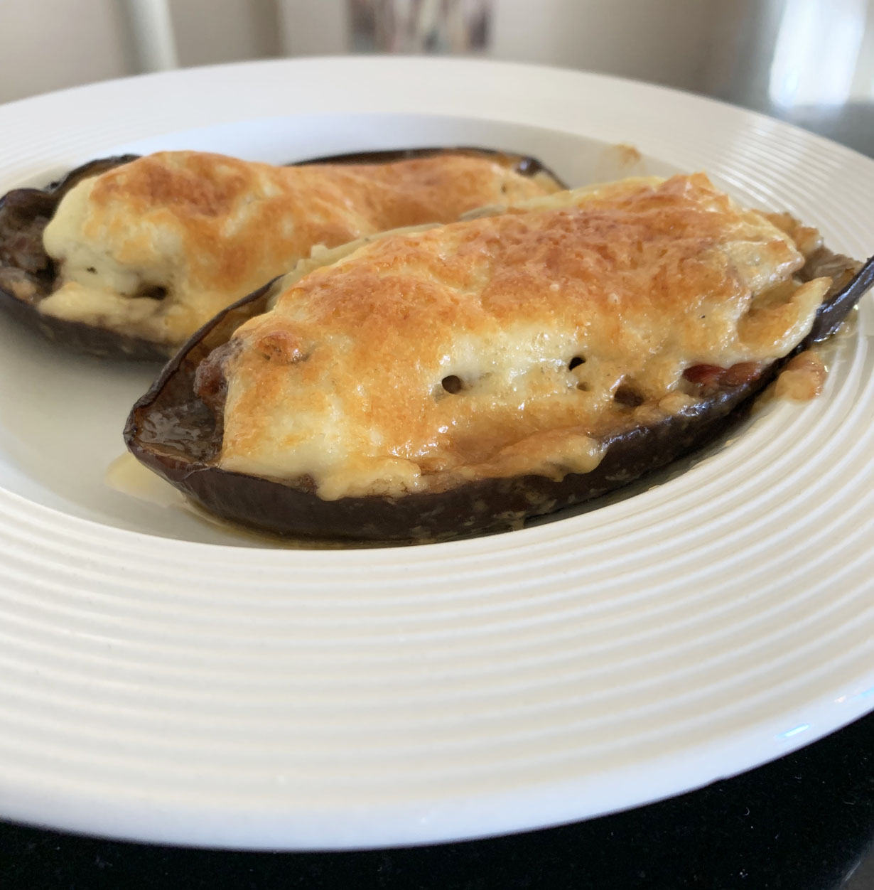 Using a tablespoon, fill each eggplant half with the meat mixture. Top with the prepared bechamel and sprinkle with cheese. Baked covered for 1 hour and then uncover for an additional 1/2 hour. Serves 4 to 6.