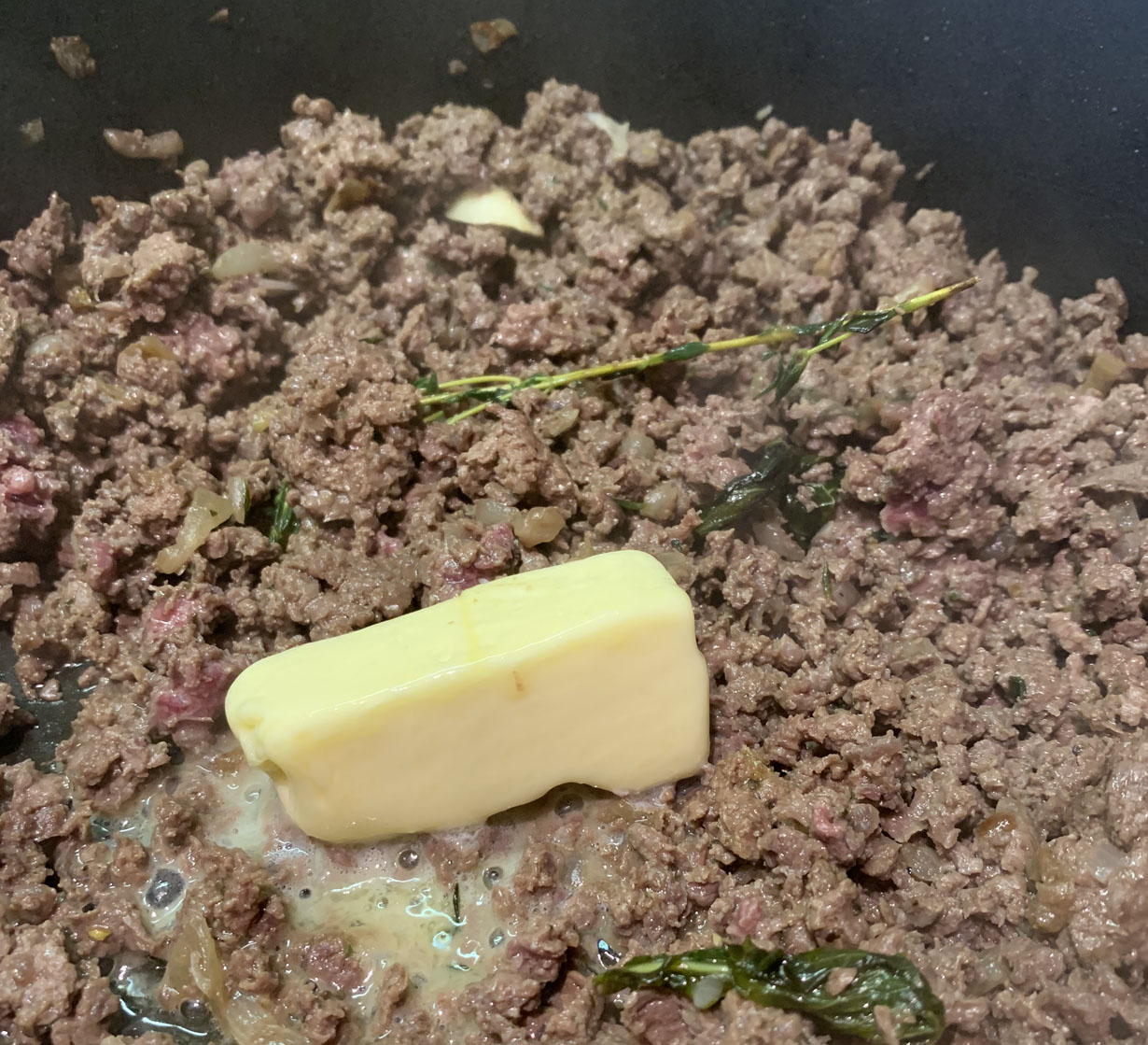 Heat the cooking pot for a few minutes and then add the oil. Add the onion, garlic, basil and thyme to the heated oil and cook until the onion is translucent (approximately 3 minutes). Add the venison and spices and cook the meat through completely. Dilute the tomato paste in the stock and add to the cooked meat. Simmer the sauce until completely reduced and thickened. Once thickened, add the butter and melt into the sauce.