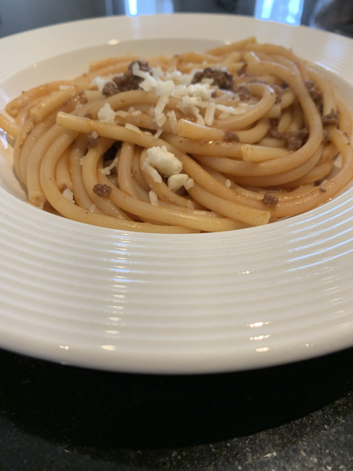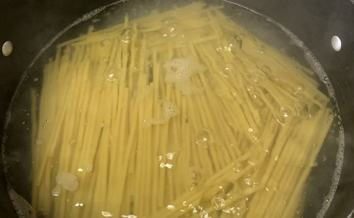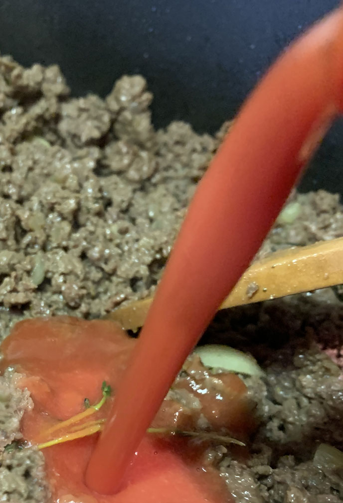 In a separate pot, heat the water and add the pasta. Cook for 8 minutes and then add the reduced meat sauce to the water, cooking until the sauce thickens (approximately 30 minutes).