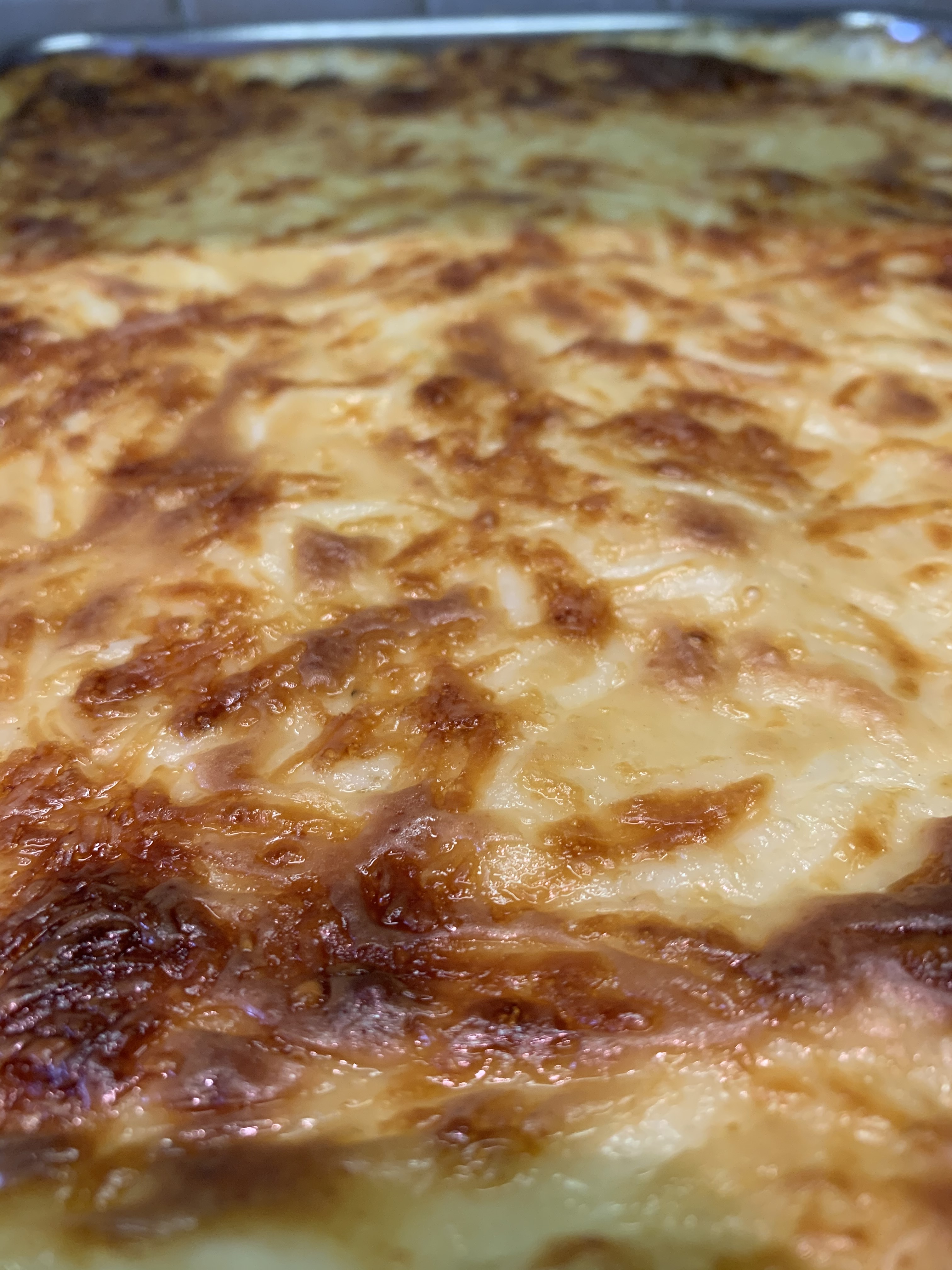 In a pan, layer some sauce, then the drained pasta, and cover with a layer of grated cheese. Cover with the remaining meat sauce and another layer of grated cheese. Cover with the bechamel and then with another layer of cheese. Cook in a preheated oven for 1 1/2 hours or until crust is golden brown. Allow to rest for at least 1 hour before cutting. Makes a 14” x 16” pan.