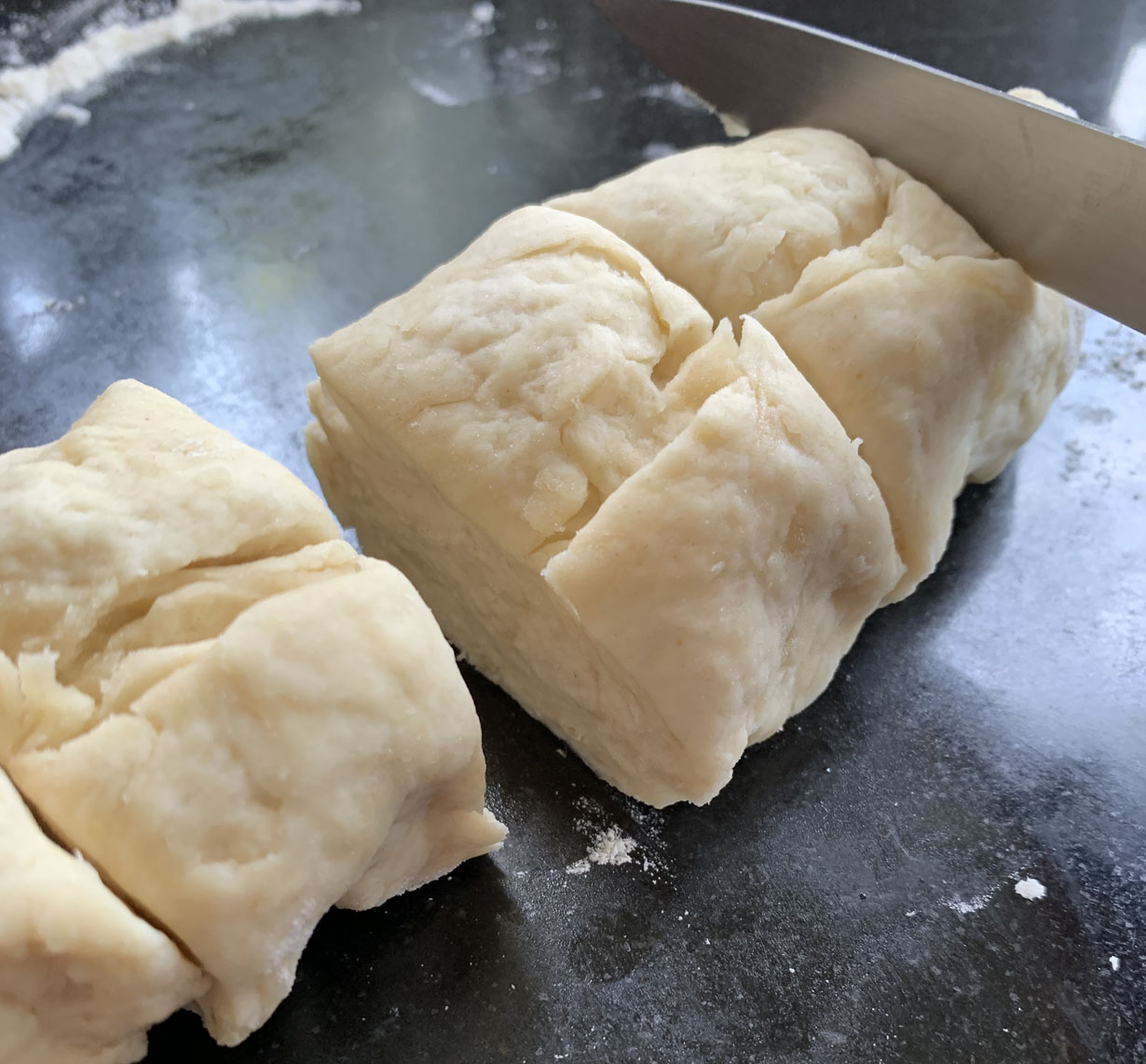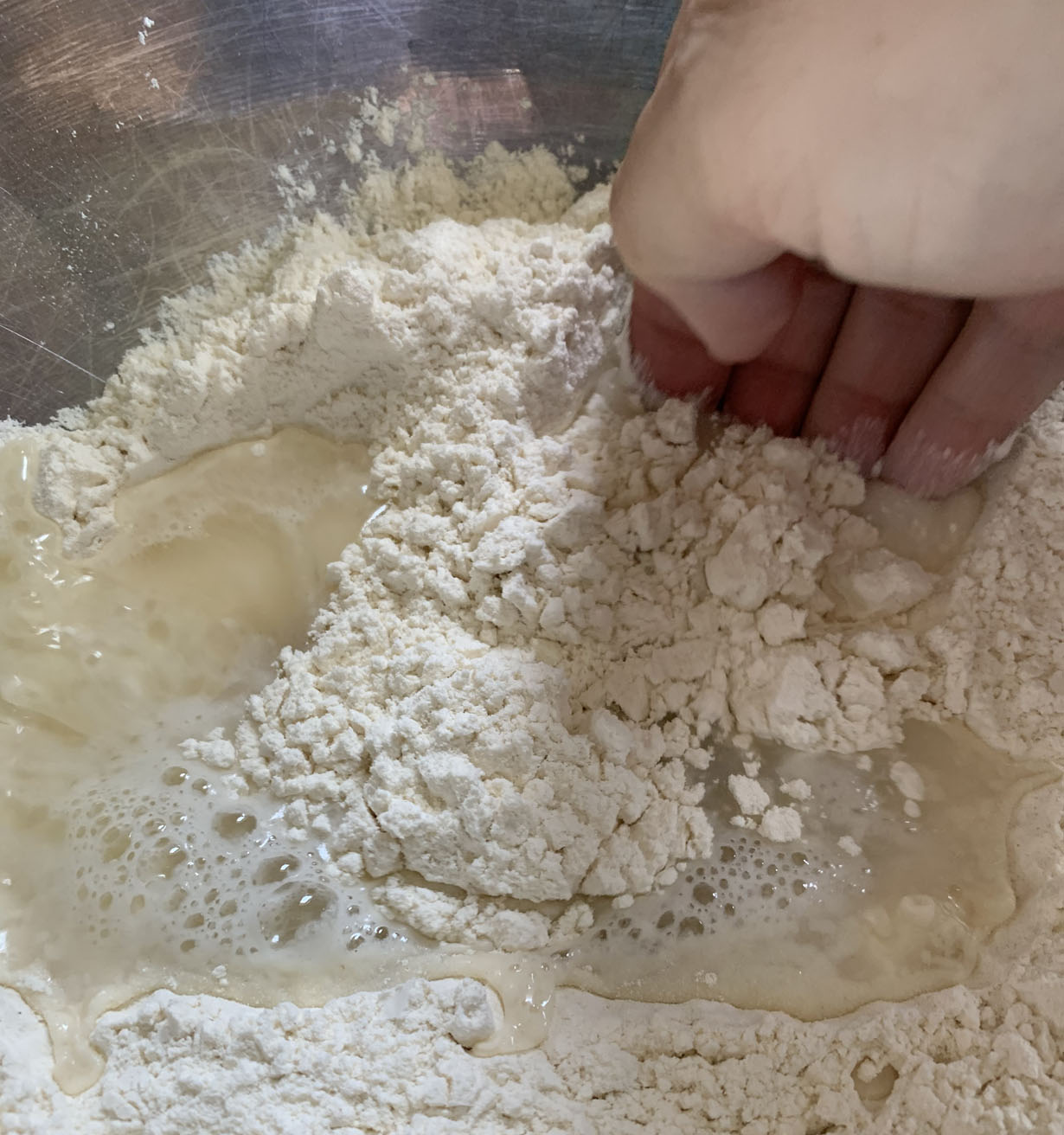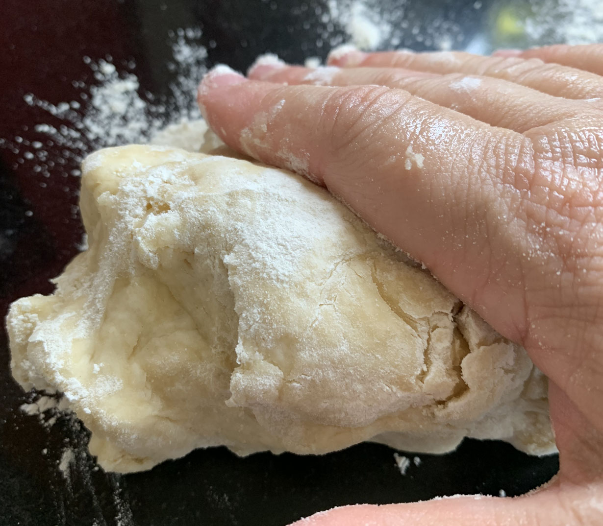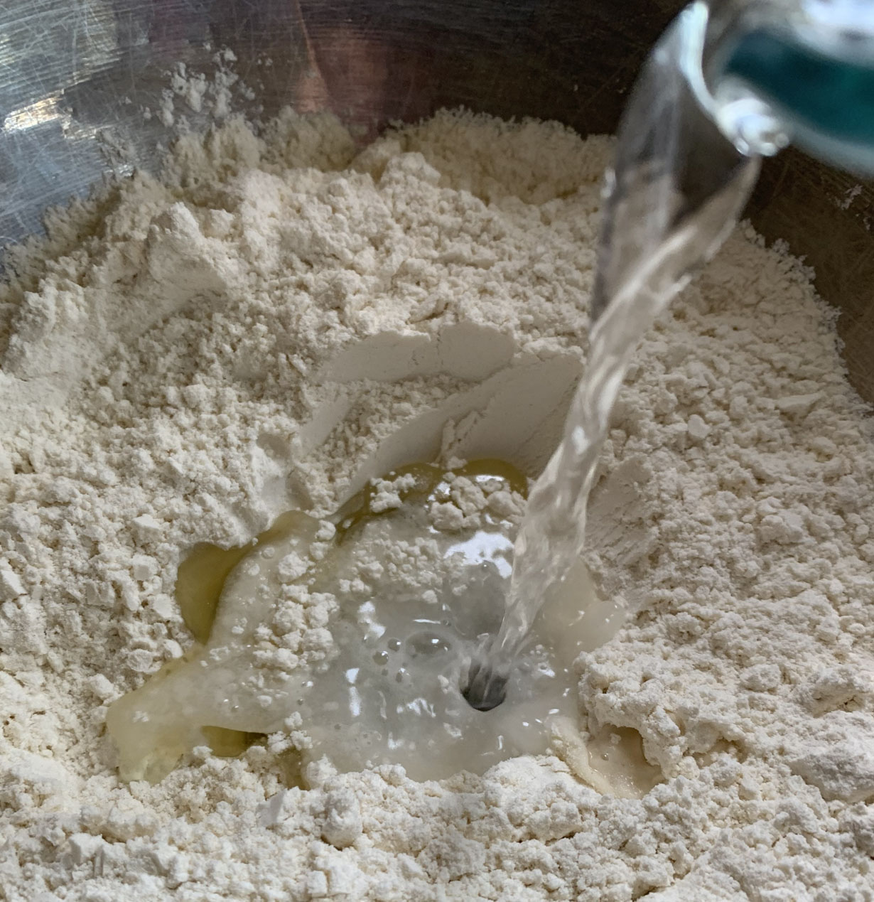 Begin by making the tortillas as they need to rest. Combine the flour, salt and baking powder and mix until well combined. Make a well in the center and add the oil and water. Stir together by pulling the flour mixture from the bottom into the center where the liquid ingredients are. Incorporate all the dry ingredients and form a ball. Turn the dough onto a lightly floured surface and knead together for two minutes. Roll out the dough into a log form and cut into eight equal pieces. Using your hands, flatten the dough into rounds and place on a parchment lined tray. If layering, place parchment between the layers. Cover with a kitchen towel and let it rest for two hours.