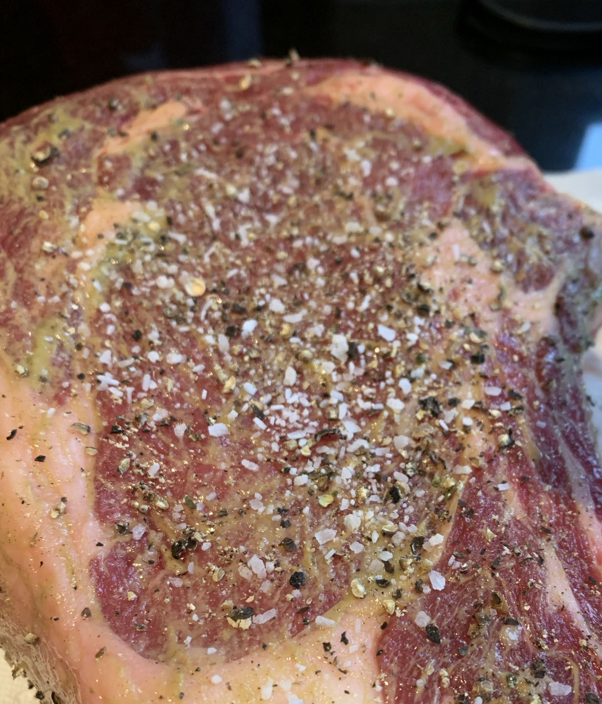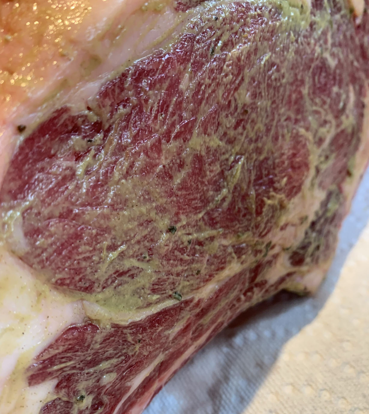 To prepare your roast, pat dry with a paper towel. Lay down a layer of the vegetables on the rack (your roast will rest on the vegetables). Season the outside of the roast on all sides with the salt and pepper (rub on the mustard before the salt and pepper if used). Rest the roast with the bone down onto the vegetables.
