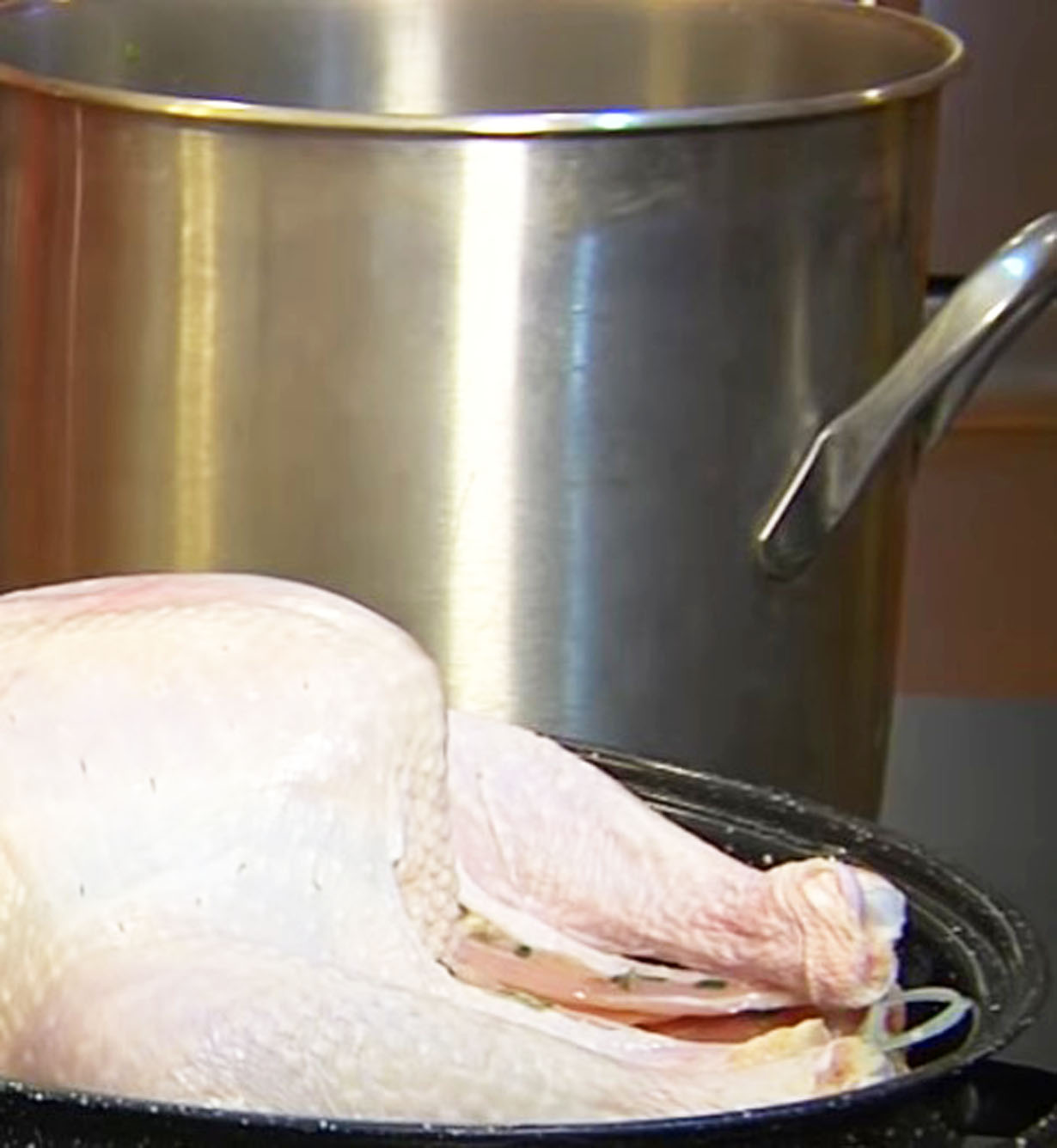 Once cooked, allow the turkey to rest in the pan for 1/2 hour. Remove the turkey from the roasting pan and place on a cutting board. lined with parchment paper or a towel underneath. You will need quite a bit of room to carve the turkey. The juices in the pan can be used to make a gravy (use a dripping separator to remove any oils). Test for salt and thicken with 1 tablespoon cornstarch and 1 cup water.
