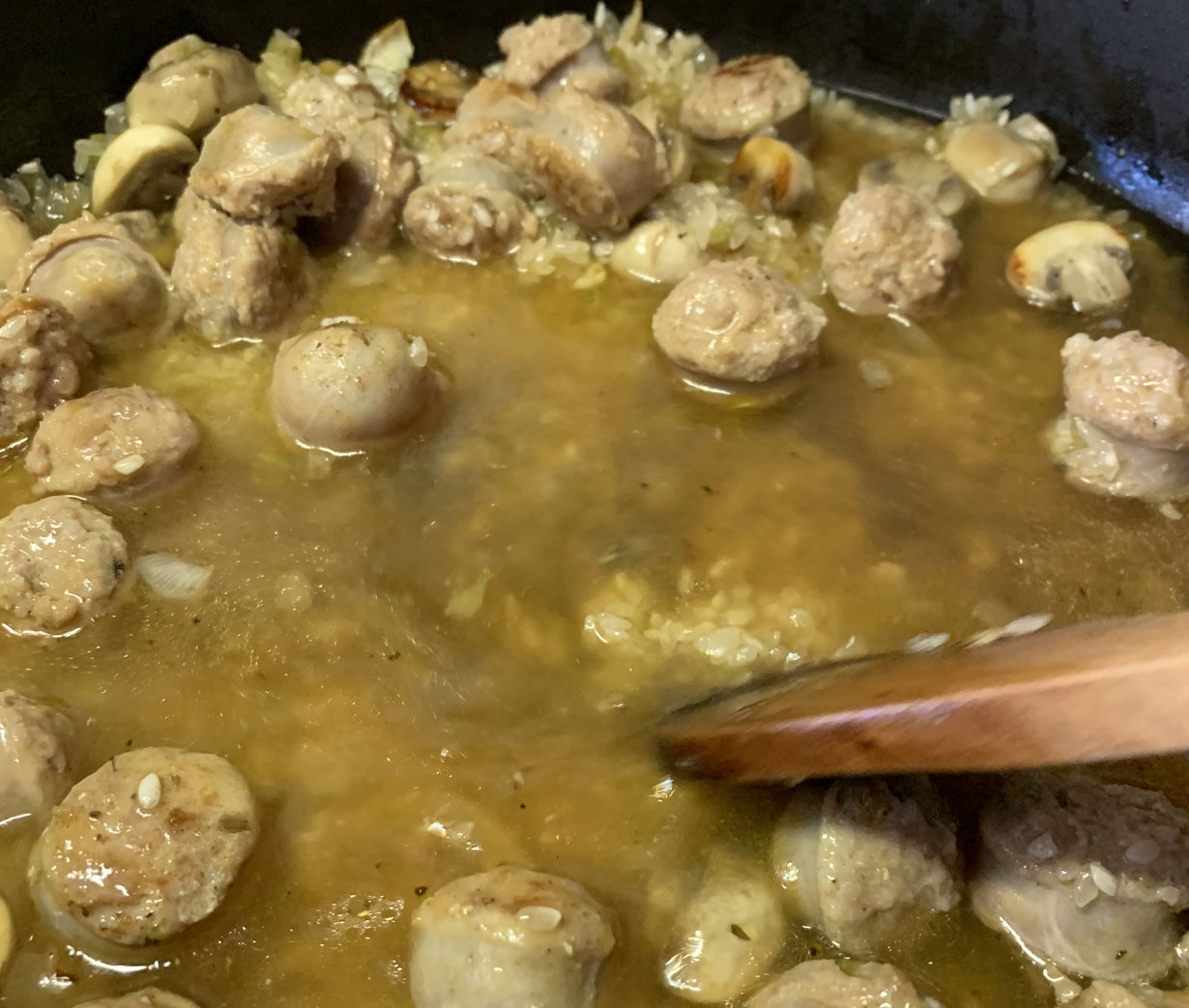 Once the sausages have cooked, add the rice and the spices and toss to coat the rice with the oils from the pan. Brown the rice for 2 minutes and add 1/2 cup of the stock, stirring in to mix it thoroughly. Continue to add stock as it is absorbed by the rice. Stir the rice continuously to ensure that the moisture is evenly absorbed. Check the consistency of the rice once all the stock has been added, and if needed, add additional stock until the rice is cooked. Ensure that there is some liquid left as this will create a creamier consistency when the cheese and butter is added.