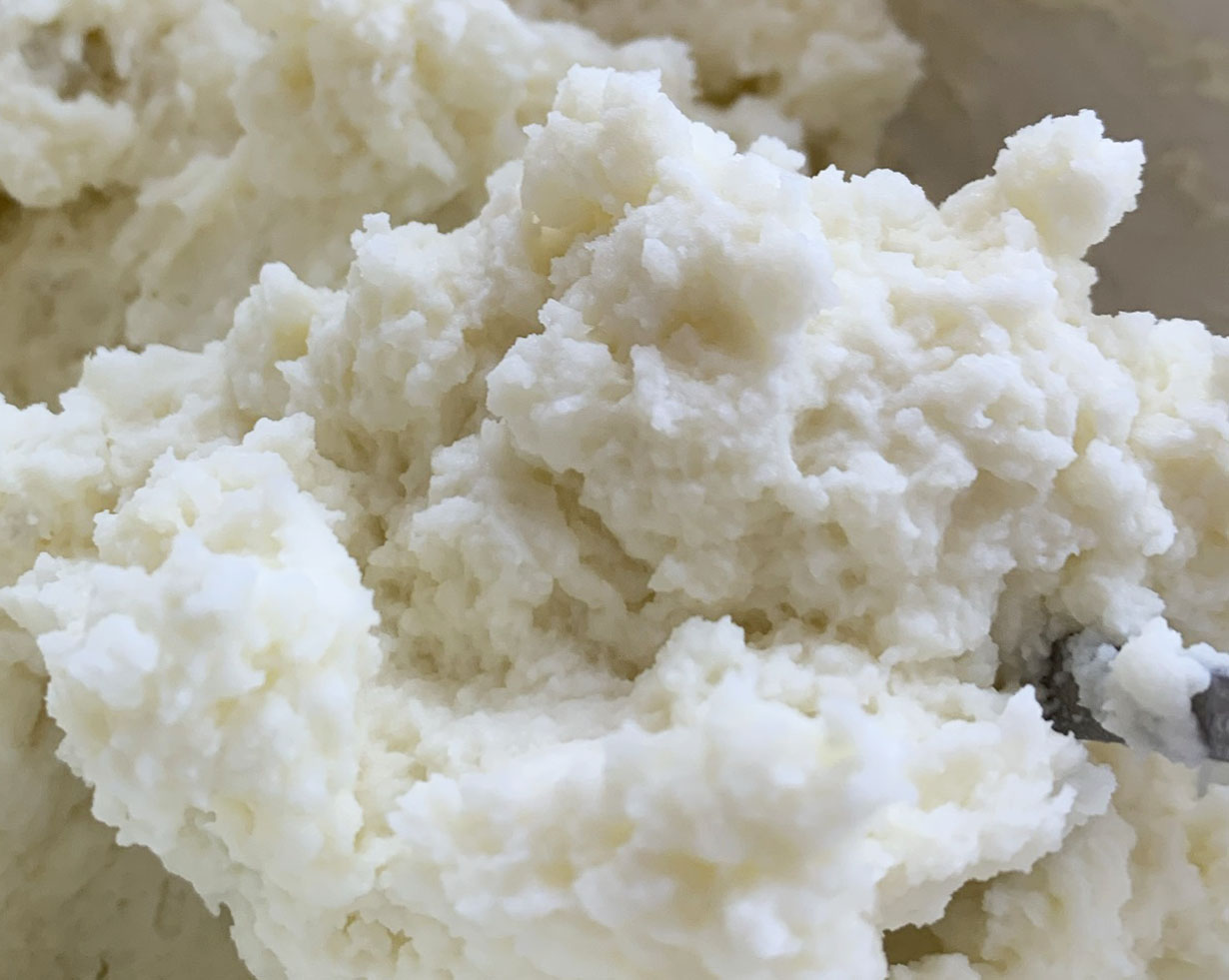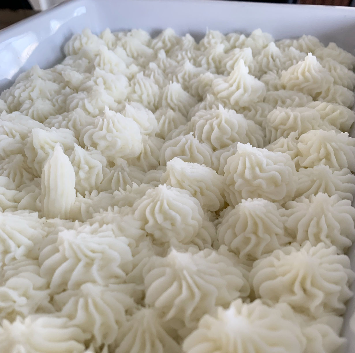 Mix together the prepared mashed potatoes with the sour cream to loosen them up enough to pipe through a bag fitted with a star tip. Hold the piping bag perpendicular to the baking dish and squeeze for 3 seconds and lift to create a star. Continue until the entire surface is covered with mashed potatoes.