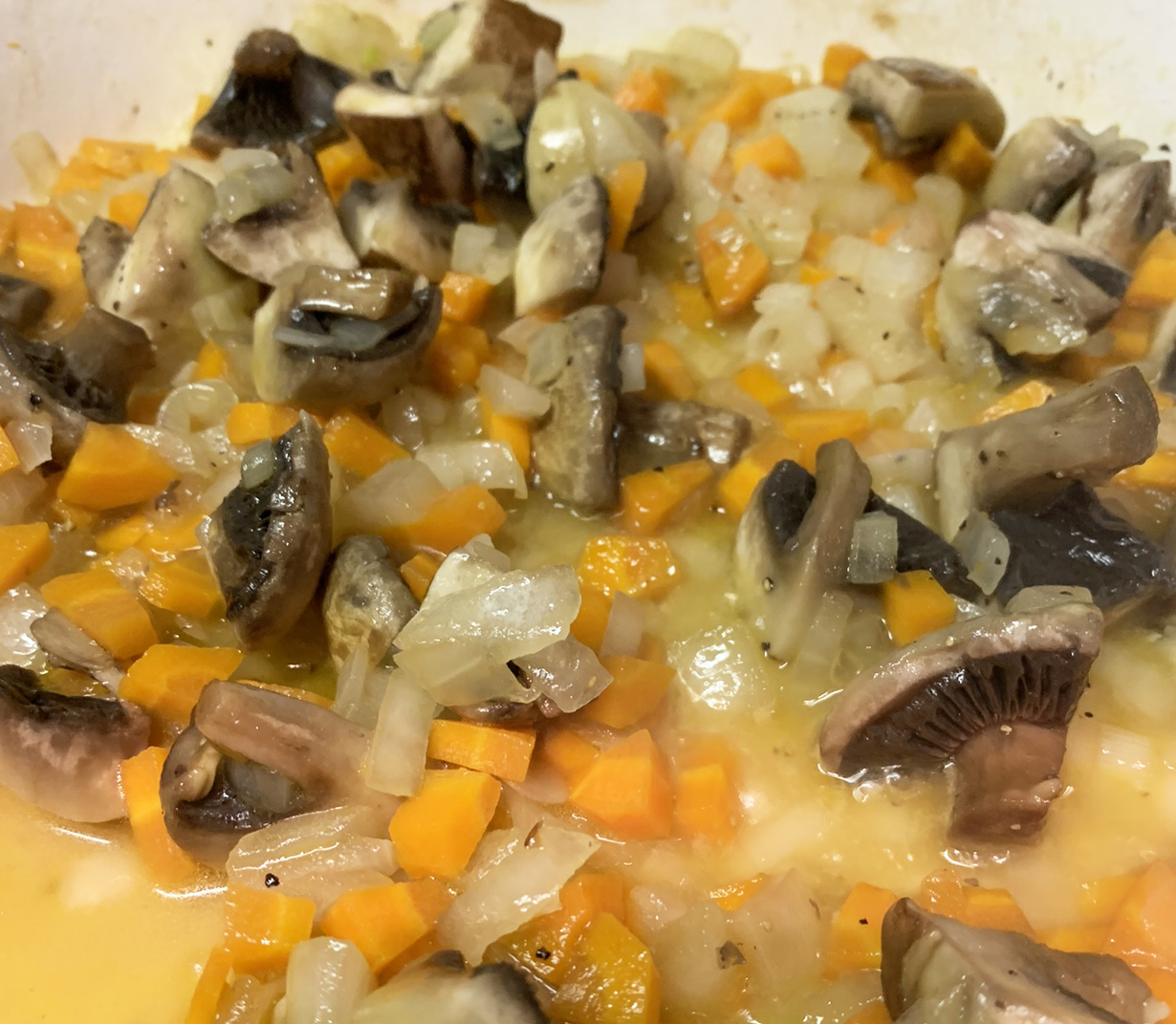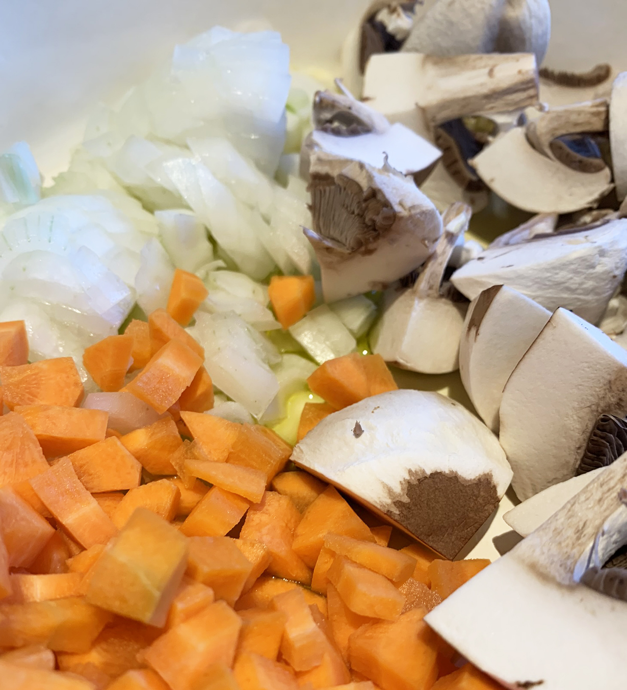 Preheat the oven to 350 degrees Fahrenheit. Place vegetables and butter in a cast iron skillet and season with salt. Cook on medium heat until the onions are softened (approximately 3 minutes). Remove from heat and add the frozen peas and turkey. Add the stock and return to heat. Melt the cornstarch in the water and add to the mixture. Stir continuously until the sauce is thickened. This only takes a few minutes.