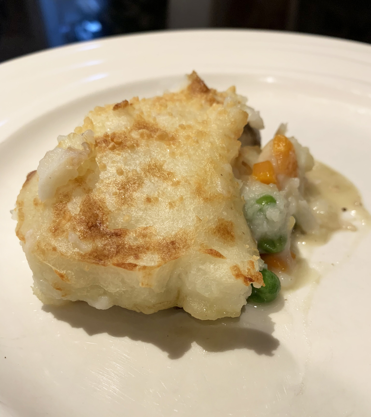 Once the sauce is thick, transfer the meat mixture to an oven-safe baking dish. Top with the leftover mashed potatoes. Note: if you have sweet potatoes left over, mash them and mix them with the mashed potato. Sprinkle with parmesan cheese. Bake in the oven for 20 minutes, or until the potatoes and cheese is golden brown on top.