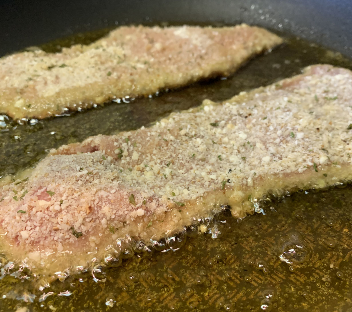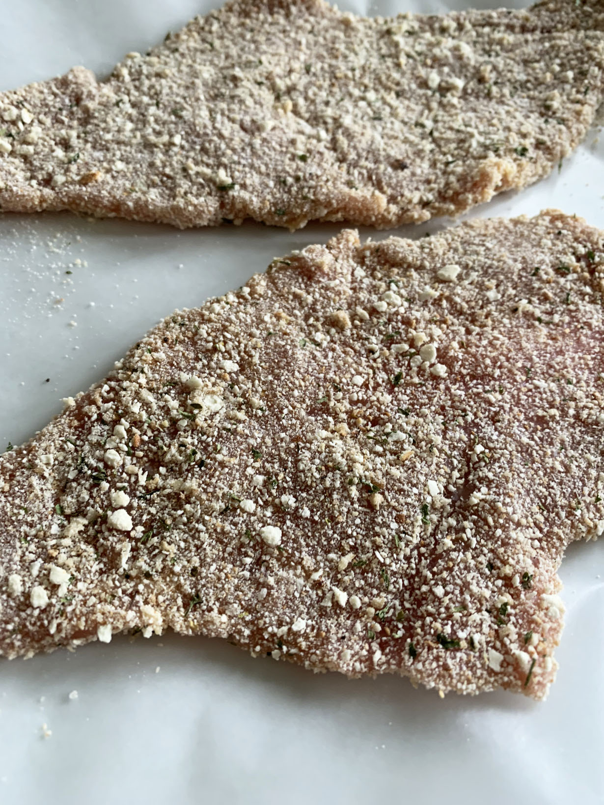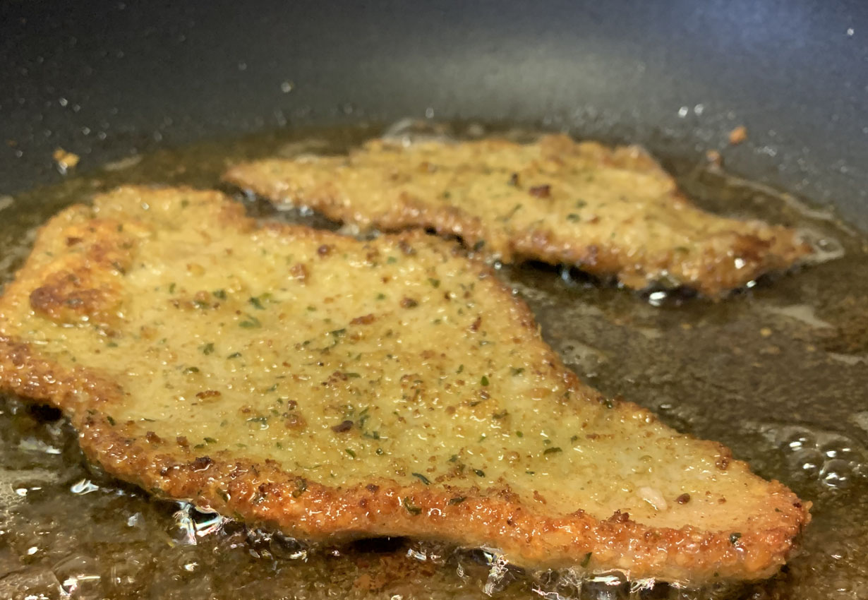 Lightly beat the egg and season with lemon pepper and salt. Toss the veal pieces in the egg and let rest for 30 minutes, occasionally turning over. You can use pre-seasoned bread crumbs or quickly create your own seasoned crumbs (recipe on the side). Spread a layer of crumbs on parchment paper. Place a piece of the veal on the bread crumbs and push into the crumbs to adhere to the veal. Turn the piece over and repeat this process. Note: the standard breading technique includes dredging in flour first, then moistening in an egg wash (beaten egg plus a tablespoon or two of water or milk), and finally coating in crispy breadcrumbs. This makes a much thicker coating than just the egg-bread crumb but either works.