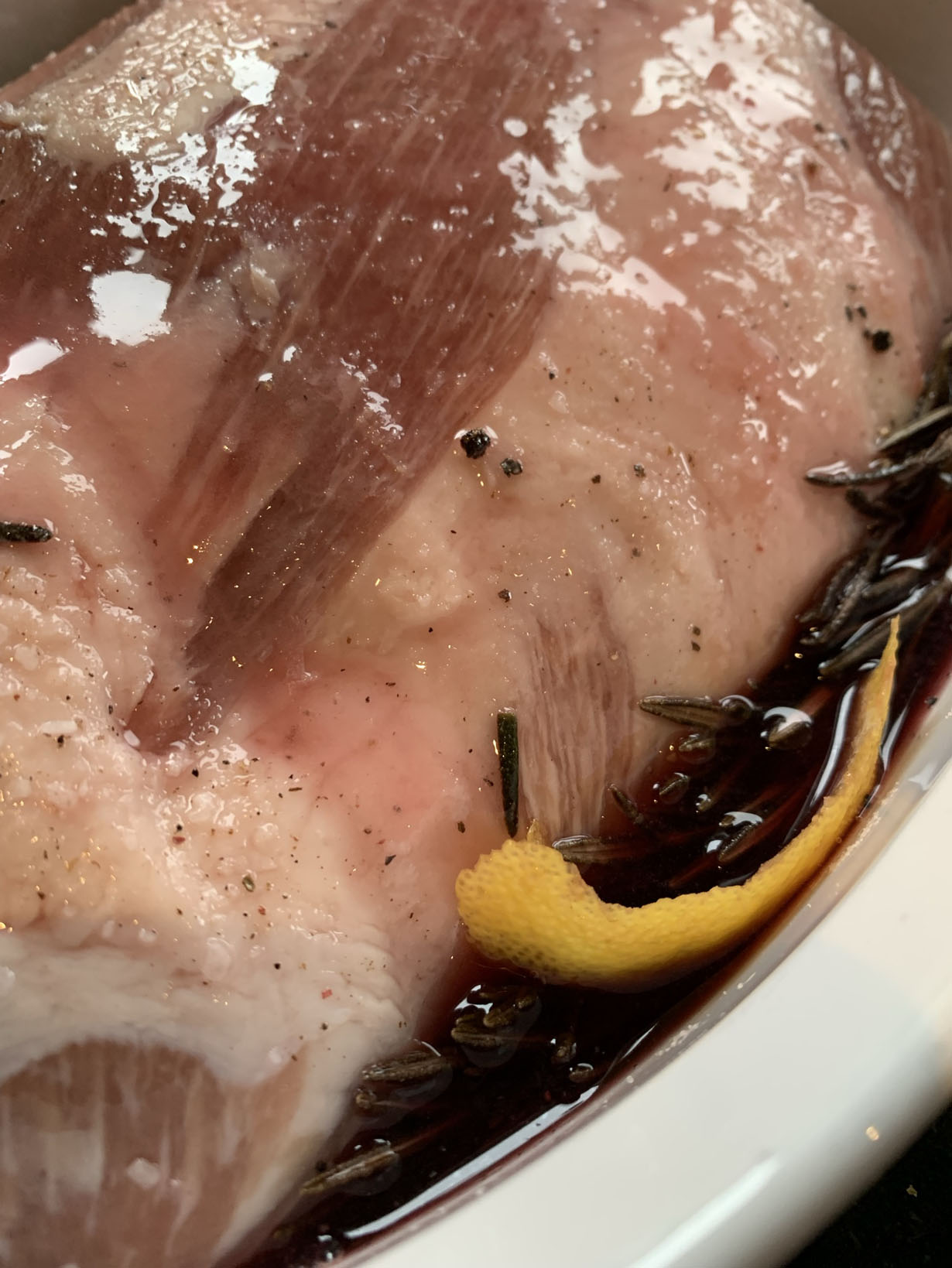 Make a few crosscuts across the pork fat. Lift the layer of fat and place one sprig of rosemary underneath. Season the outside of the roast with salt and pepper. Prepare the marinade by mixing together the wine, lemon juice, sugar, brandy, and lemon rind using one of the rosemary sprigs. Place the pork, fat side up, in a deep casserole dish and pour the wine over the roast. Place the two rosemary sprigs on either side of the roast. Cover and let sit in the refrigerator overnight.