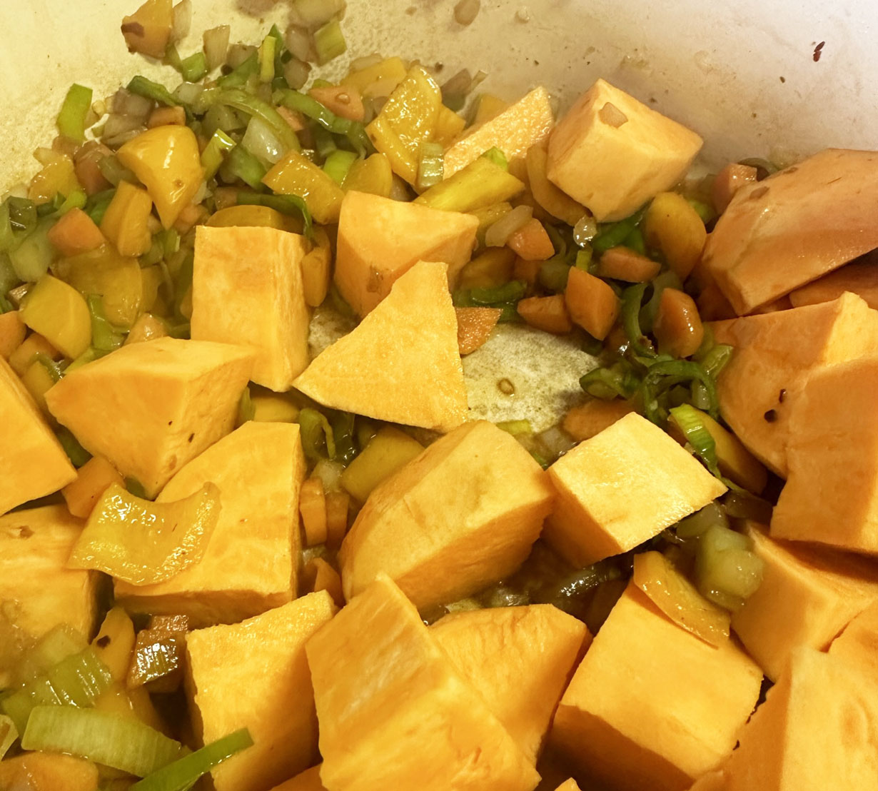 Chop and slice all the vegetables and set aside. Heat the oil on medium-high in a cast iron pot and add the onion, red pepper, garlic, carrot, leek, and celery. Cook for 3 minutes and stir in the seasonings. Add the wine and reduce until it is soaked up by the vegetables (approximately 10 minutes). Add the sweet potatoes and black beans and stir until combined. Cook for an additional 2 minutes, and then add in the grapes, passata, and stock. Cover and simmer for 40 minutes on medium-high, stirring occasionally.