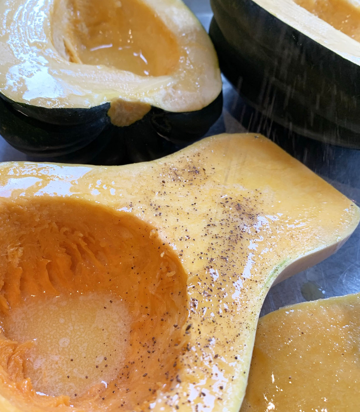 Preheat the oven to 350°F. Cut each squash in half and discard the seeds. Brush the insides of the squash with the melted butter. Season with salt, white pepper, and nutmeg. Turn squash so the inside faces down and bake for 1 1/2 hours. Remove from the heat and scoop out the flesh into a food processor.