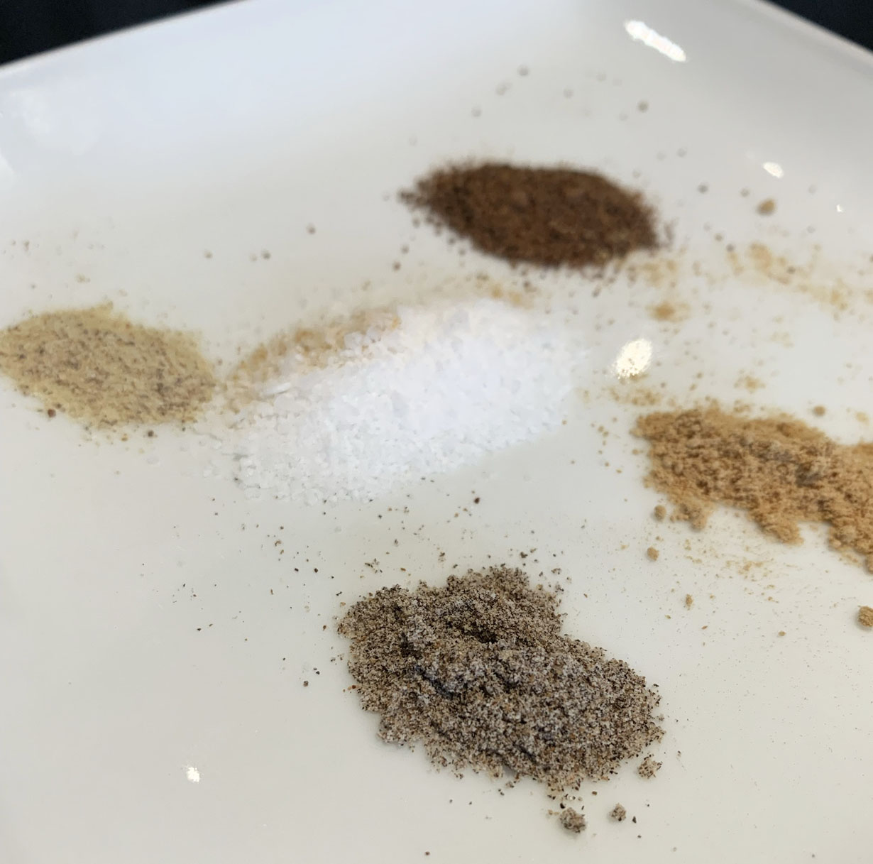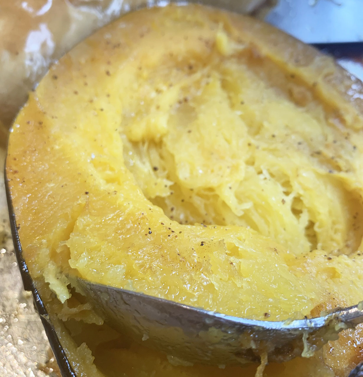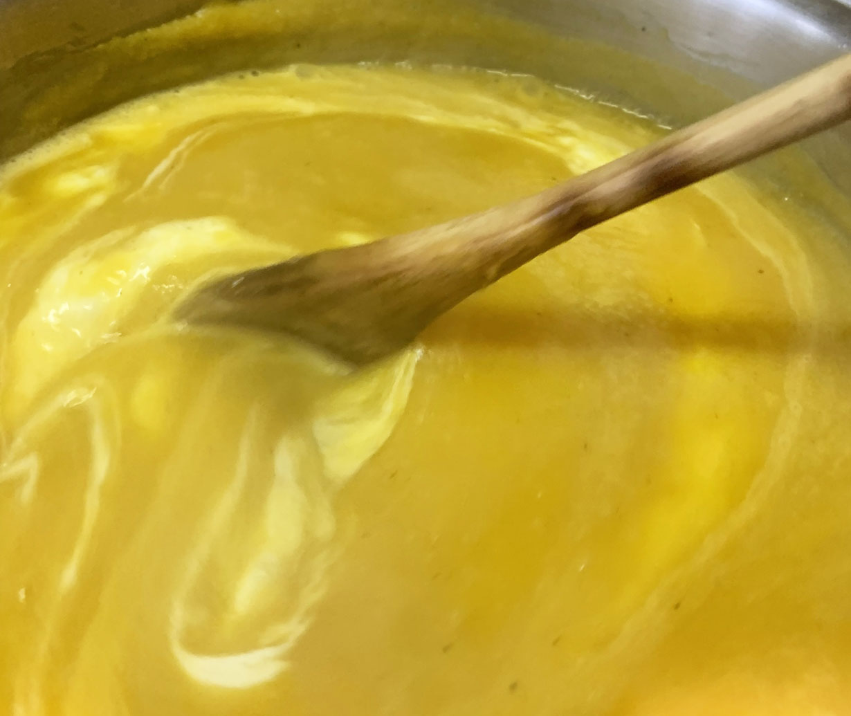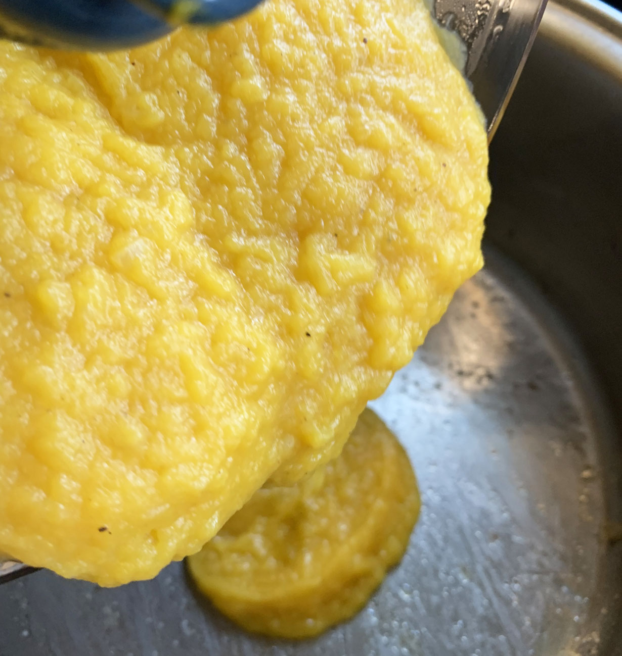 While the squash is cooking, sweat the onions in the butter. Add the salt, white pepper, nutmeg, ginger, and cardamom. Mix well and add the onions to the food processor.