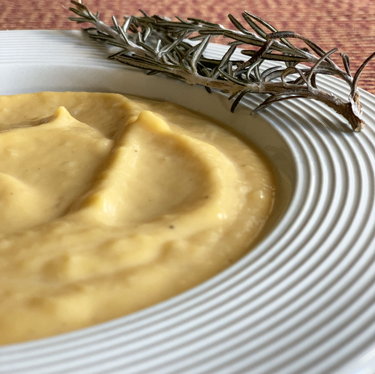 Blend the onions and the squash flesh until pureed. Add the chicken stock and blend well. Return the soup to a pot, and over low heat, bring to a boil. Stir continuously so that it does not stick. Test the soup for spices and add more if needed. While the soup is heating up, in a separate small pot, heat the cream with the rosemary sprig (do not bring to a boil). Remove the rosemary sprig and discard. Add the scented cream into the soup and stir in.