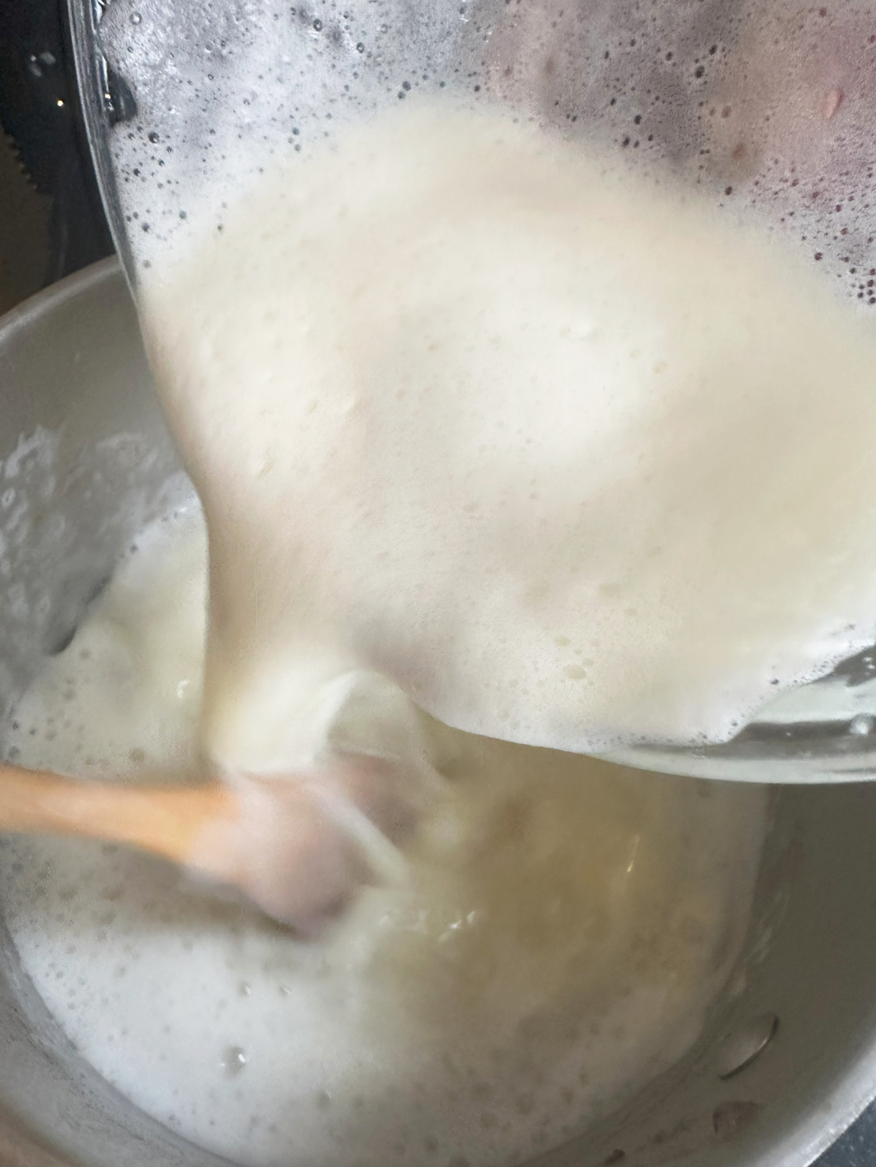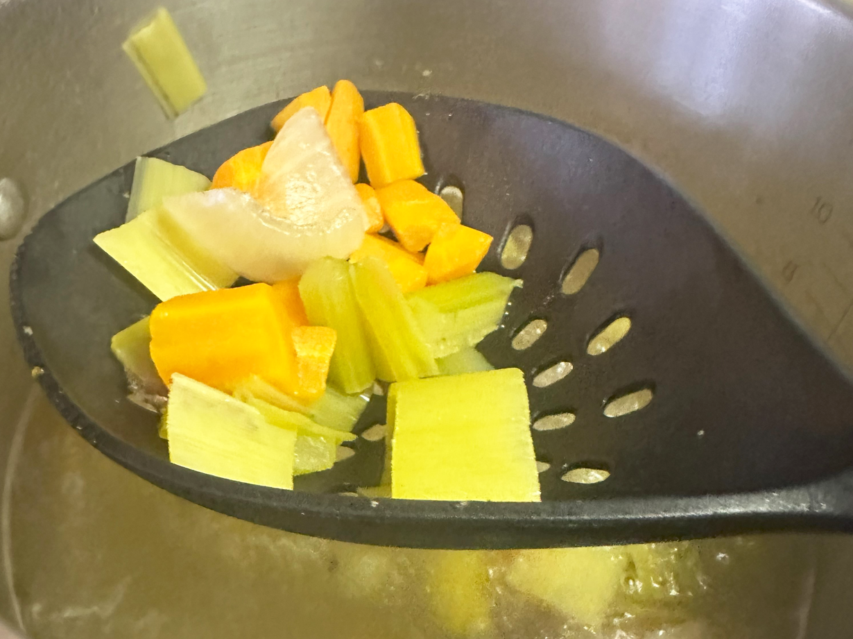 For this next part, you may want some help. While continuing to beat the egg, slowly drip in some stock until it warms up. Do not pour too much stock in at once or stop beating, as it may “cook” the egg. Once the egg is completely tempered, add the egg-soup mixture to the remaining soup and roll the pot back and forth to distribute the egg throughout. Add the chicken pieces and roll the pot again.