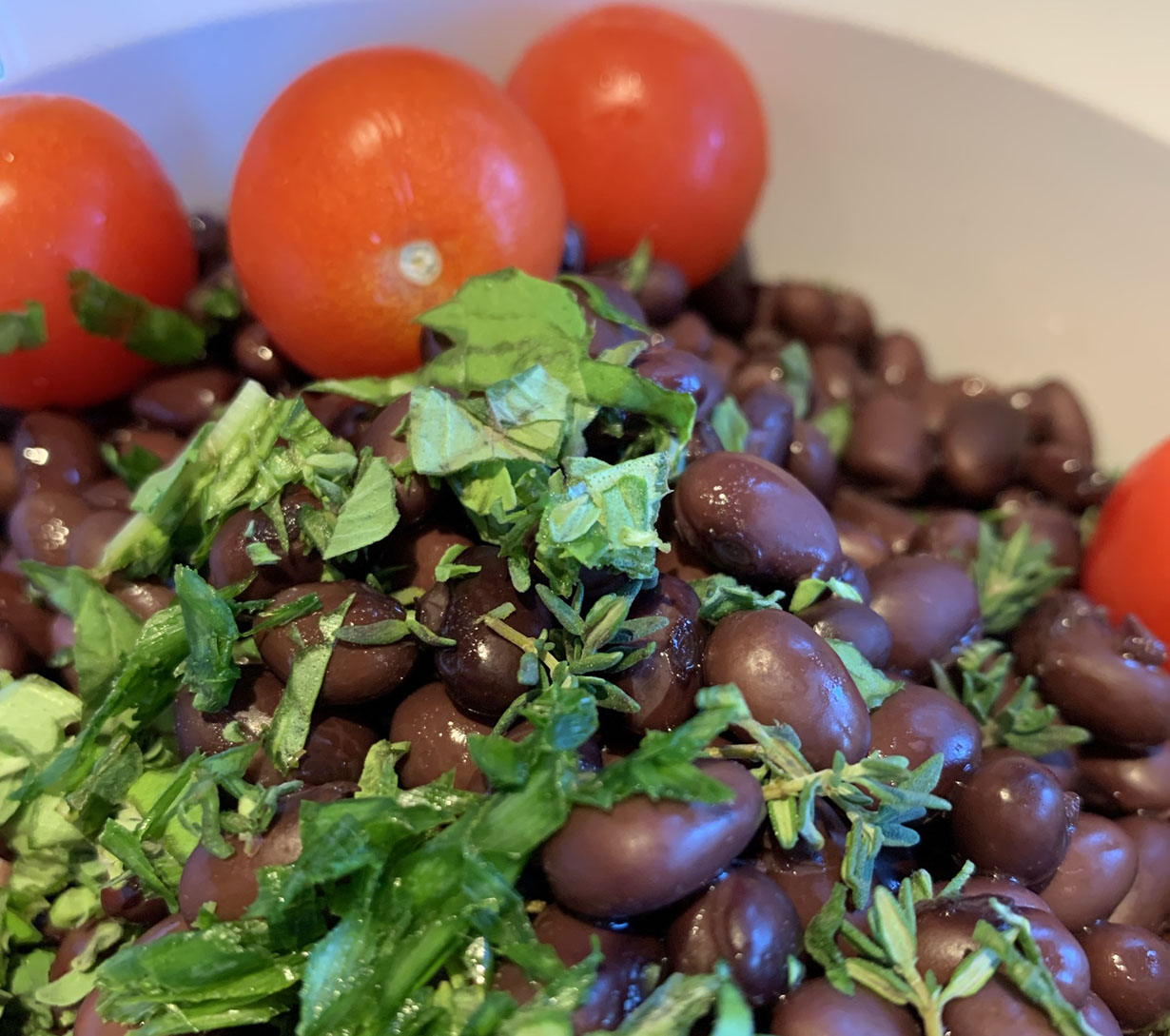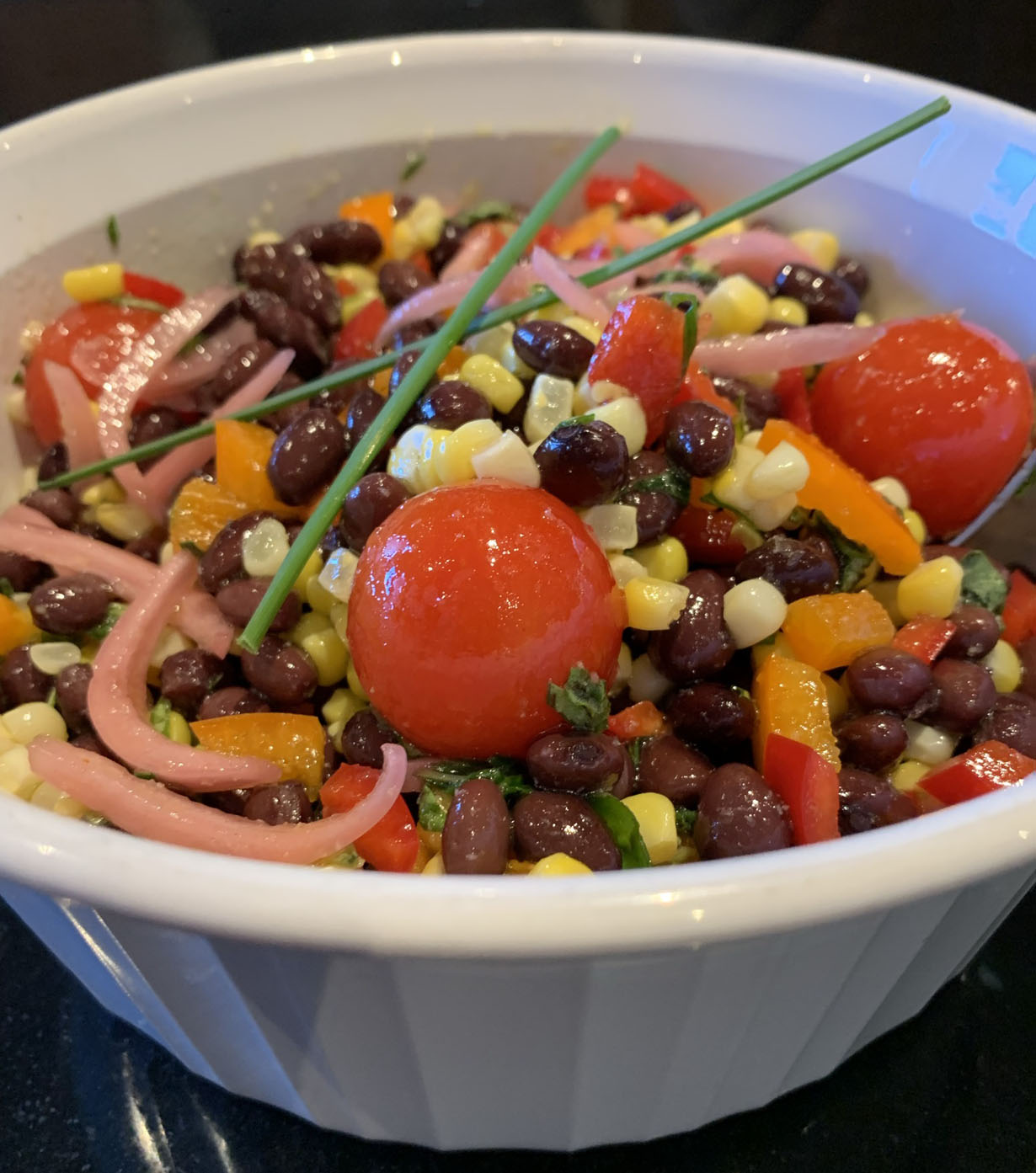 A delicious combination of sweet corn and buttery black turtle beans make this a great salad anytime of the year. The fresh lime adds a bit of citrus and the Serrano pepper a bit of heat in every bite. Topped with fresh herbs and pickled onions, it is a burst of flavor in every bite.