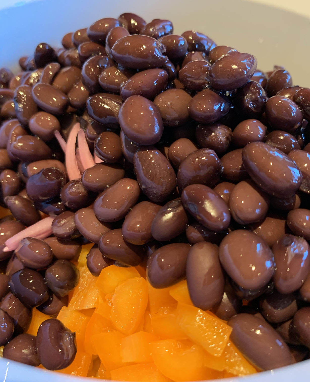 Remove the corn from the water and cut off the kernels and place them in a large bowl. Add the peppers and pickled onion. Drain the beans and rinse well under cold running water. Add to the corn mixture. Add the fresh herbs and the tomatoes. Add the prepared dressing and toss until all the ingredients are coated.