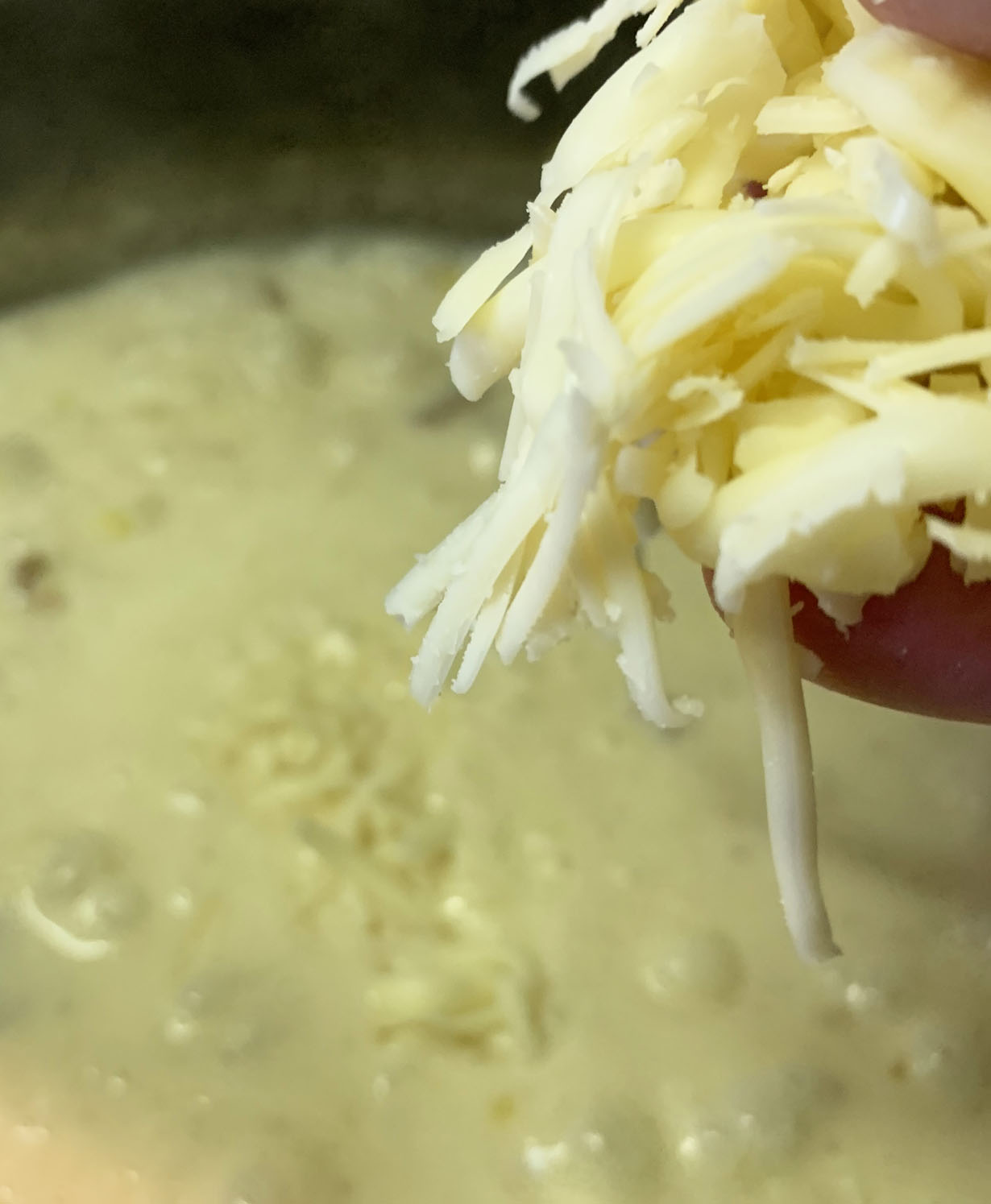 Serve soup warm. Garnish with thin slices of cheese (cheddar works well as the colour stands out). Makes 4 to 6 servings.