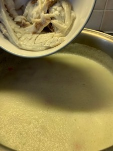 For this next part, you may want some help. While continuing to beat the egg, slowly drip in some stock into the egg until it warms up. Do not pour too much stock in at once or stop beating as it may “cook” the egg. Once the egg is completely tempered, add the egg-soup mixture into the remaining soup and roll the pot back and forth to distribute the egg throughout. Add the cleaned fish meat and roll the pot again.