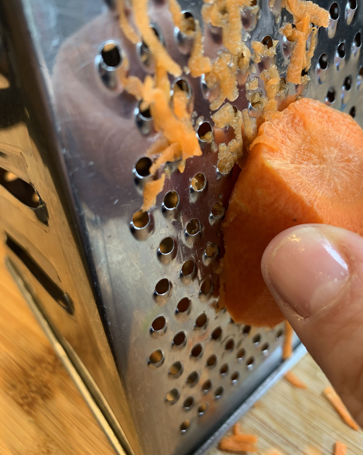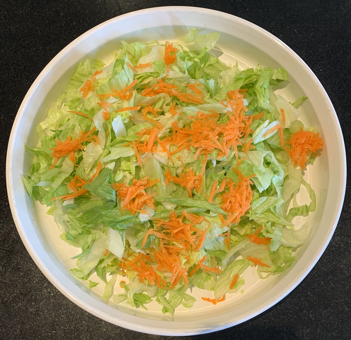 For the salad, slice the lettuce and shred the carrots. Add any additional salad ingredients as desired and drizzle with the dressing.