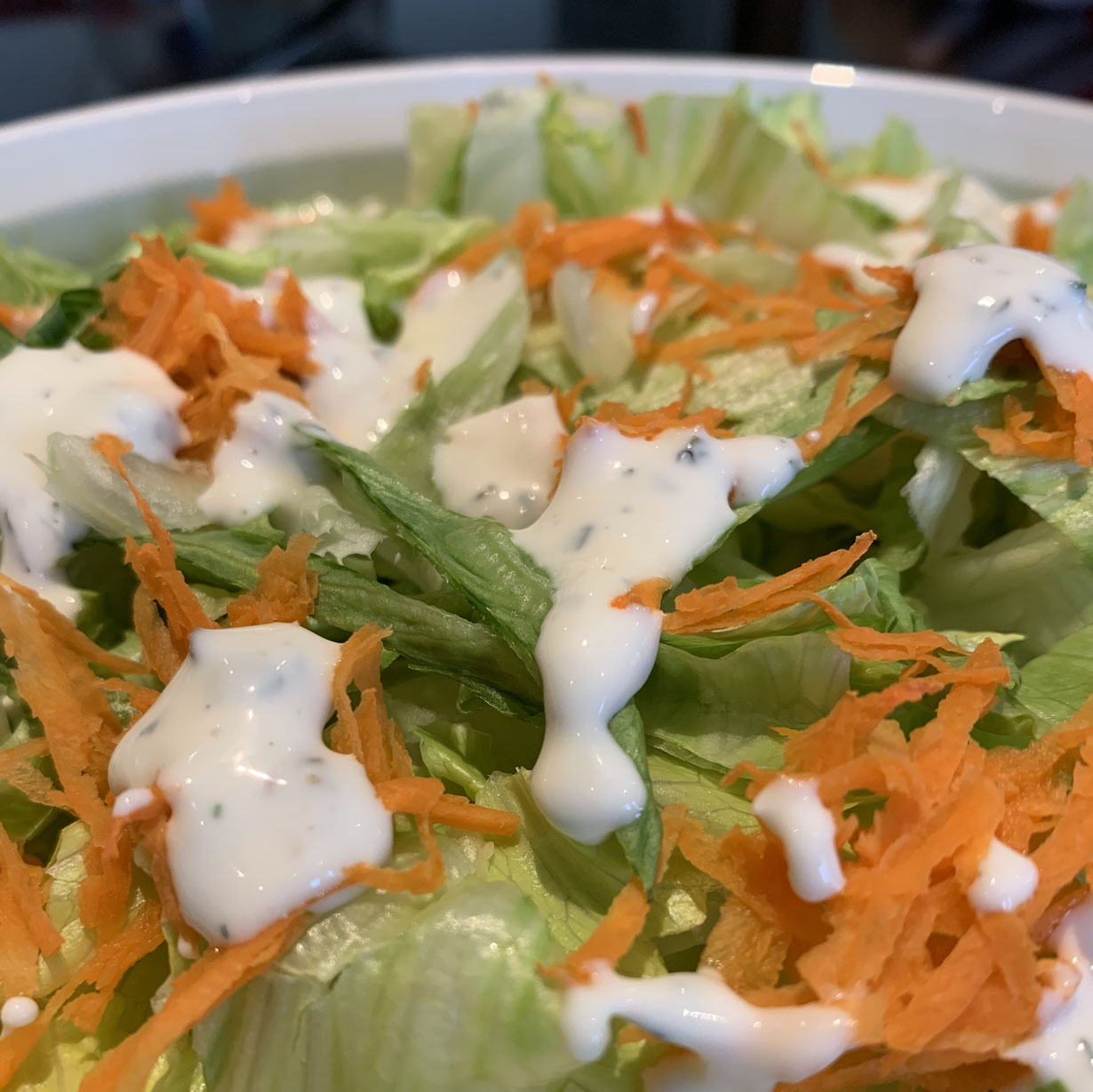 Ranch dressing is one of my favorites and so easy to make. This dressing goes great on salad, but also makes a great dip for potatoes. The salad itself is made with crisp, fresh iceberg lettuce and shredded carrots. You can certainly add other things such as onions and radishes, but I like to let the creamy dressing shine.