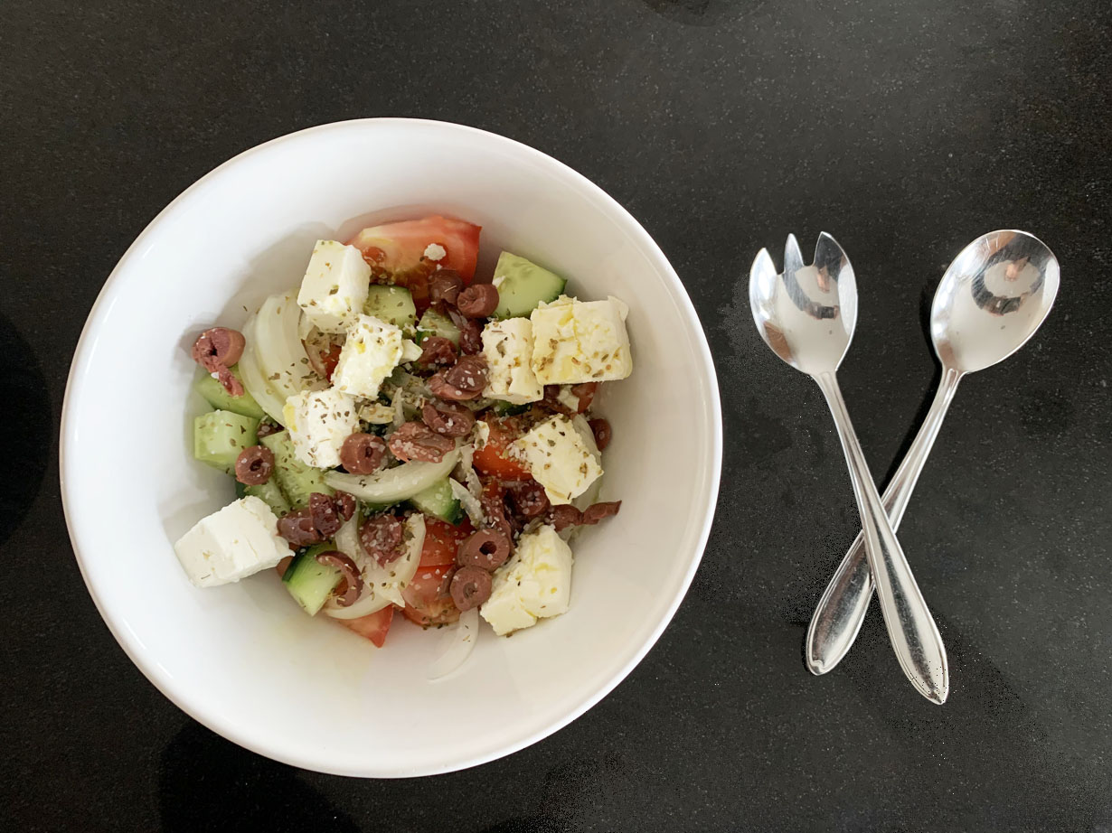 Traditional Greek tomato salad has only a few ingredients: ripe tomatoes, cucumber, olives, onion, and, of course, Greek feta. Simply dressed with an oil and vinegar dressing, it is a superb start to any meal. Make sure to use real Greek feta made with sheep milk and have lots of bread for dipping.