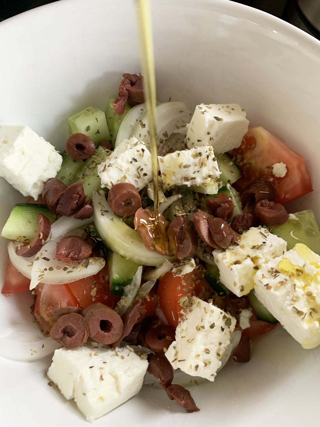 Cut tomatoes and cucumbers and add into a bowl. Add sliced onions, feta, and sliced olives. In a salad dressing shaker or a measuring cup, mix together the oil, vinegar, salt and oregano. Shake/mix well and pour over the tomatoes.