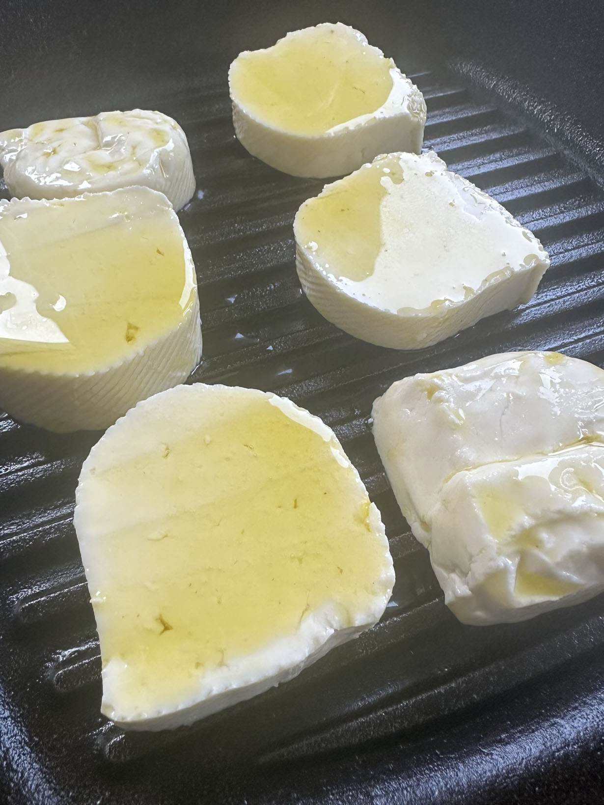 Mix together all the ingredients for the dressing and toss with the orzo. Top with the halloumi cheese.