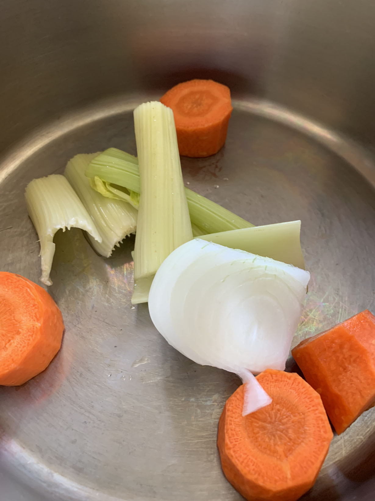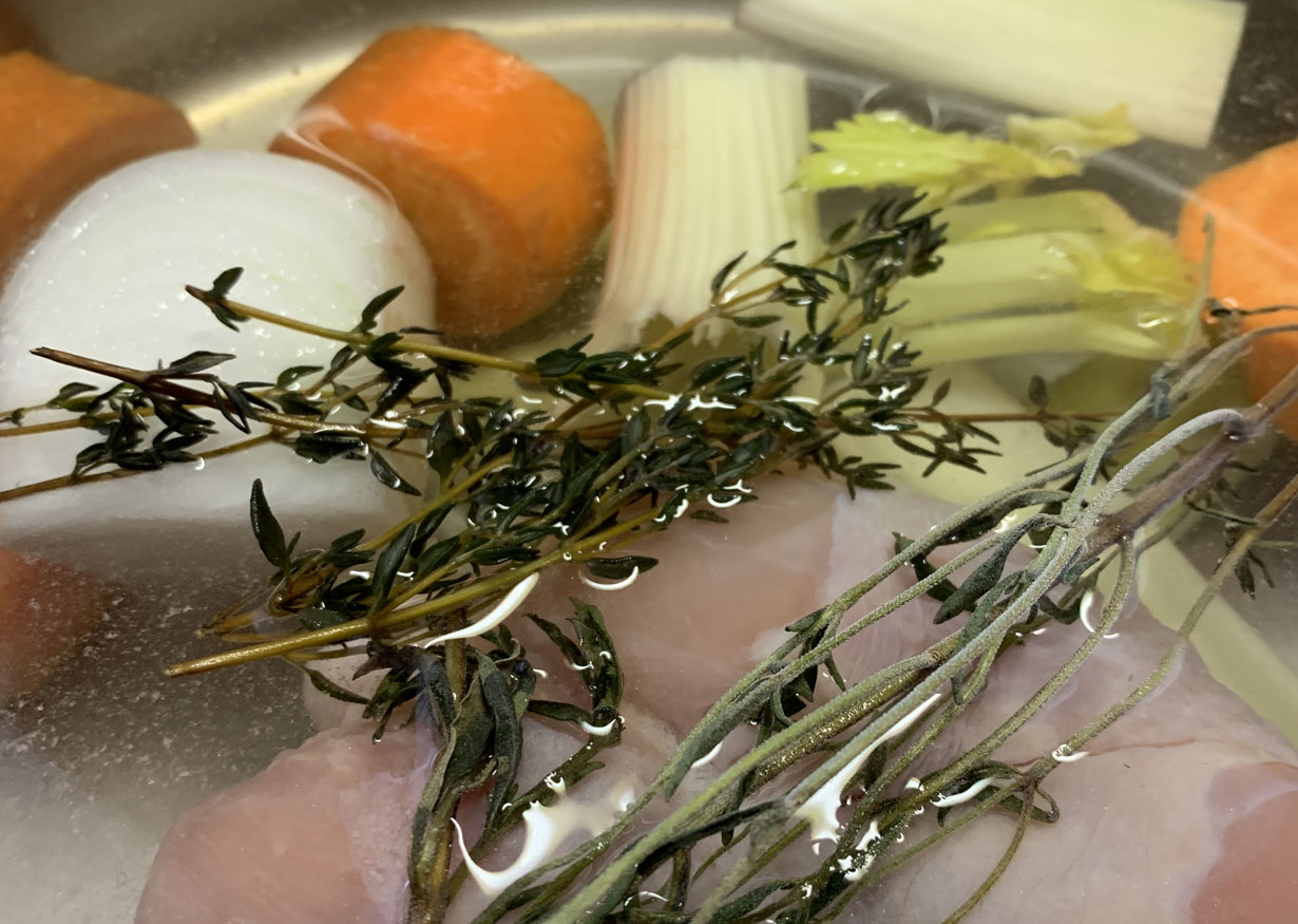 Clean and chop the carrot, onion and celery and place in the pot. Add the chicken, salt, herbs and water and bring to a boil. Remove any foam that forms on top of the pot.