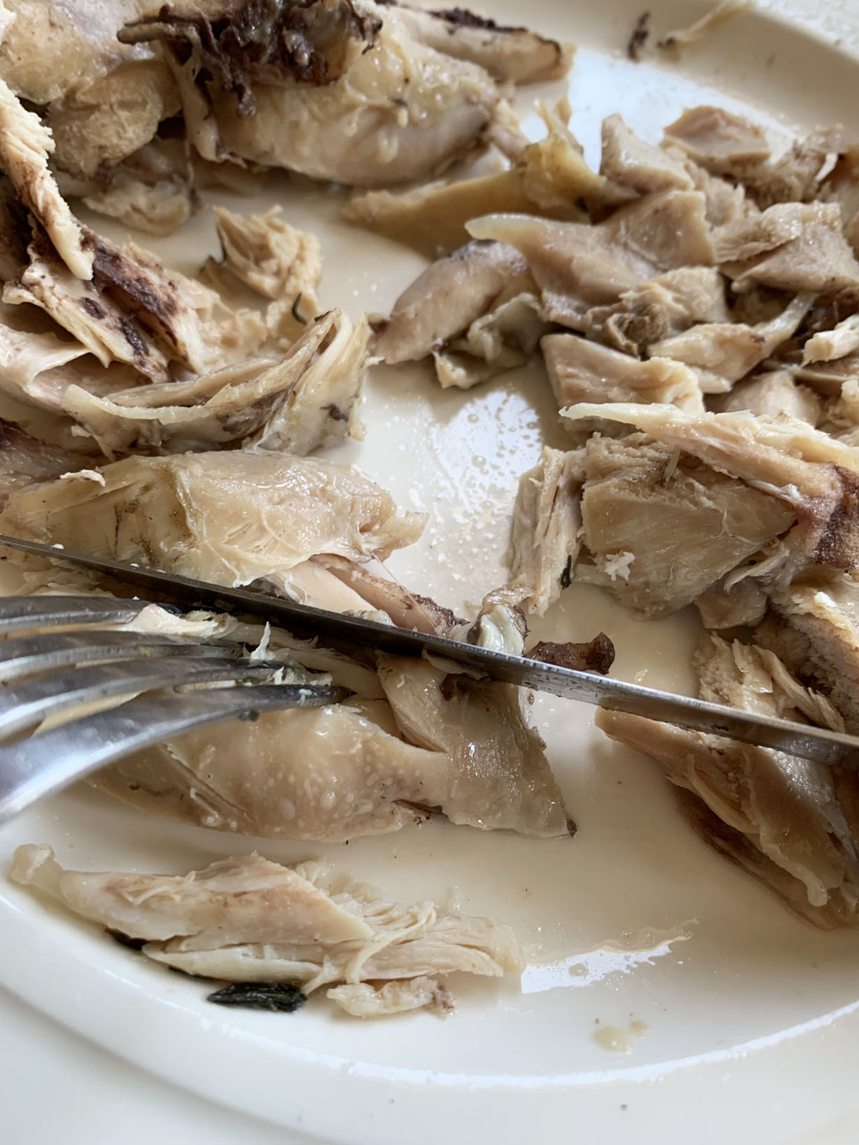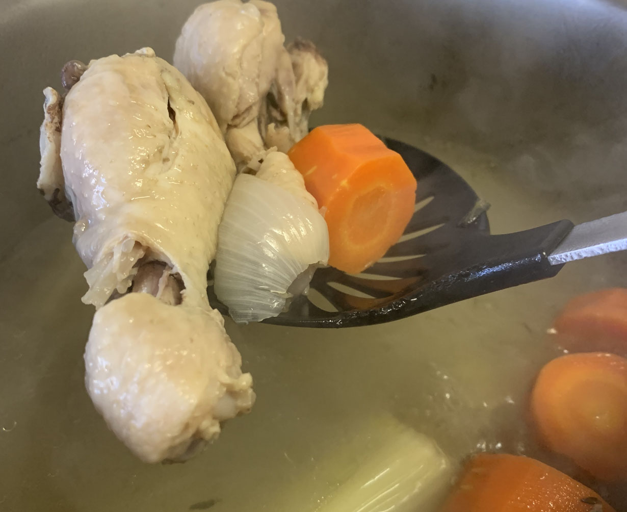 When the stock has reduced by half, remove the the chicken, vegetables and herbs with a slotted spoon. Discard the vegetables and remove the meat from the chicken. Chop the chicken into small pieces.