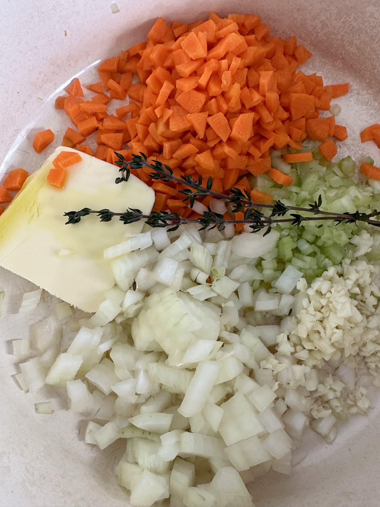 In a medium cast iron pot, add the butter, olive oil, chopped onion, carrot, celery, minced garlic, and thyme. Cook over medium heat until the vegetables begin to brown (5 minutes). Add the flour and jalapeno and mix until the flour is fully incorporated. Season with salt and smoked paprika. Add the wine and allow it to reduce for a few minutes. Add the chicken stock, crushed tomatoes, tomato paste, sugar, honey, and smoke flavoring. Mix together well.