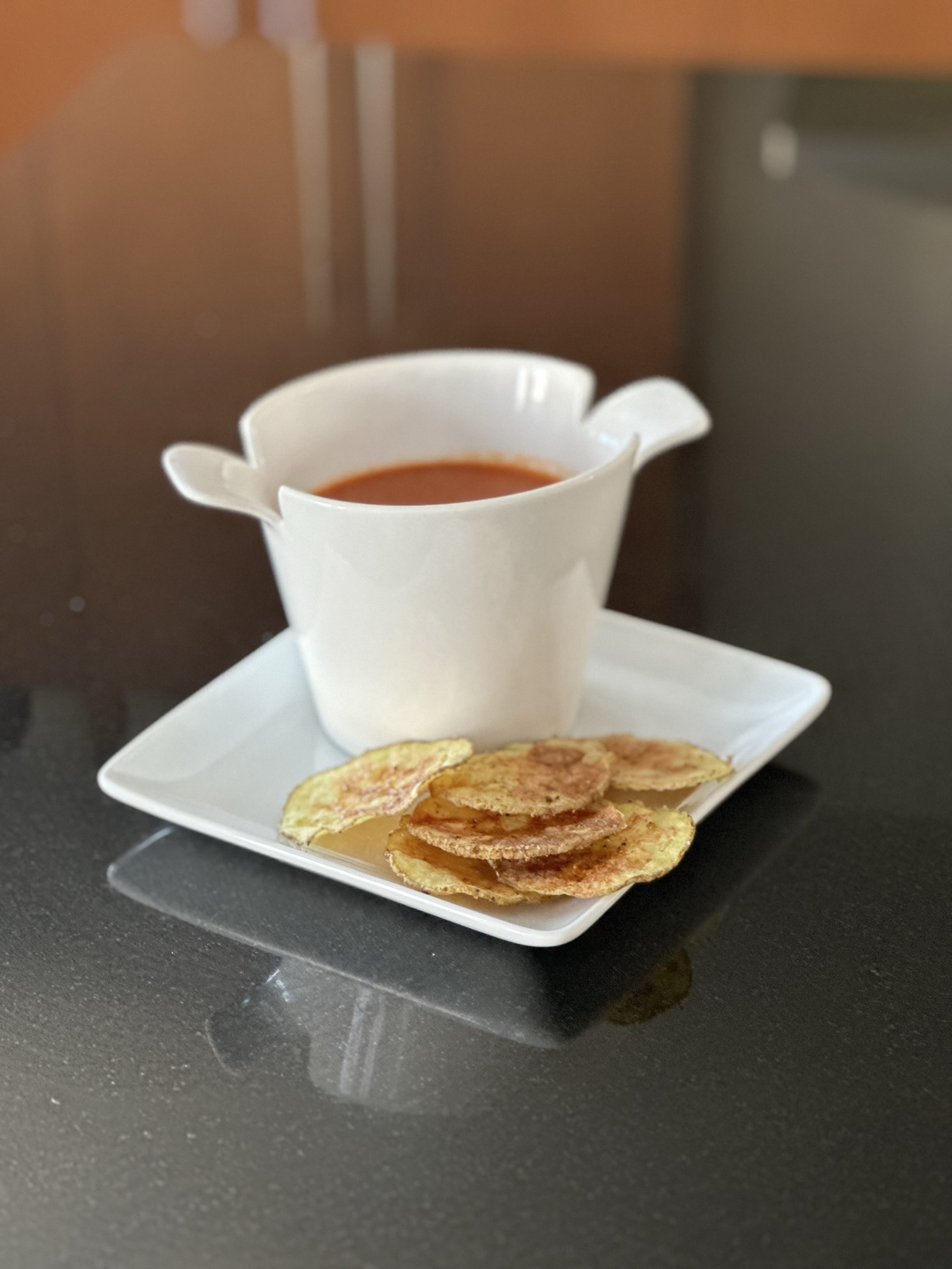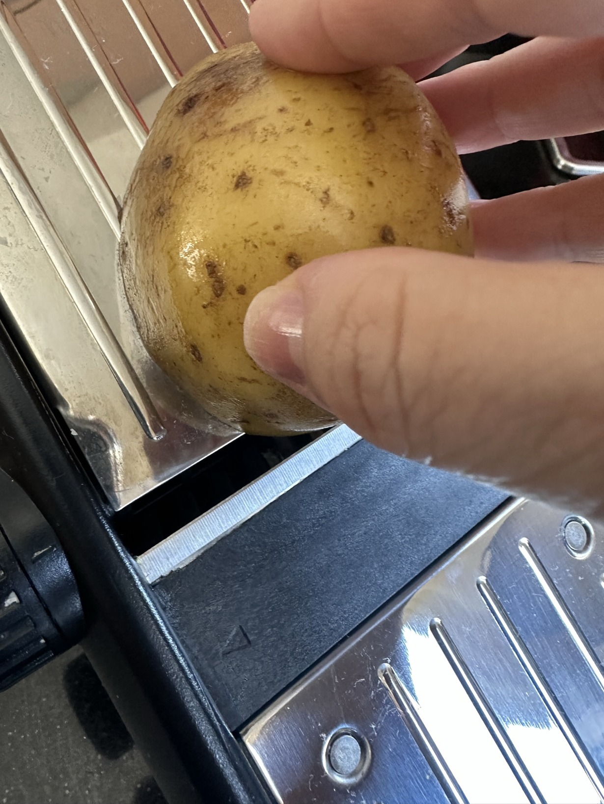 While the soup is cooking, prepare the potato chips. You will need a mandoline. Prepare an ice bath for the potatoes before starting. Cut the potatoes in half and slice on the mandoline to a 1/16-inch thickness. Immediately put the slices into the cold water bath. Repeat with the remaining potatoes.