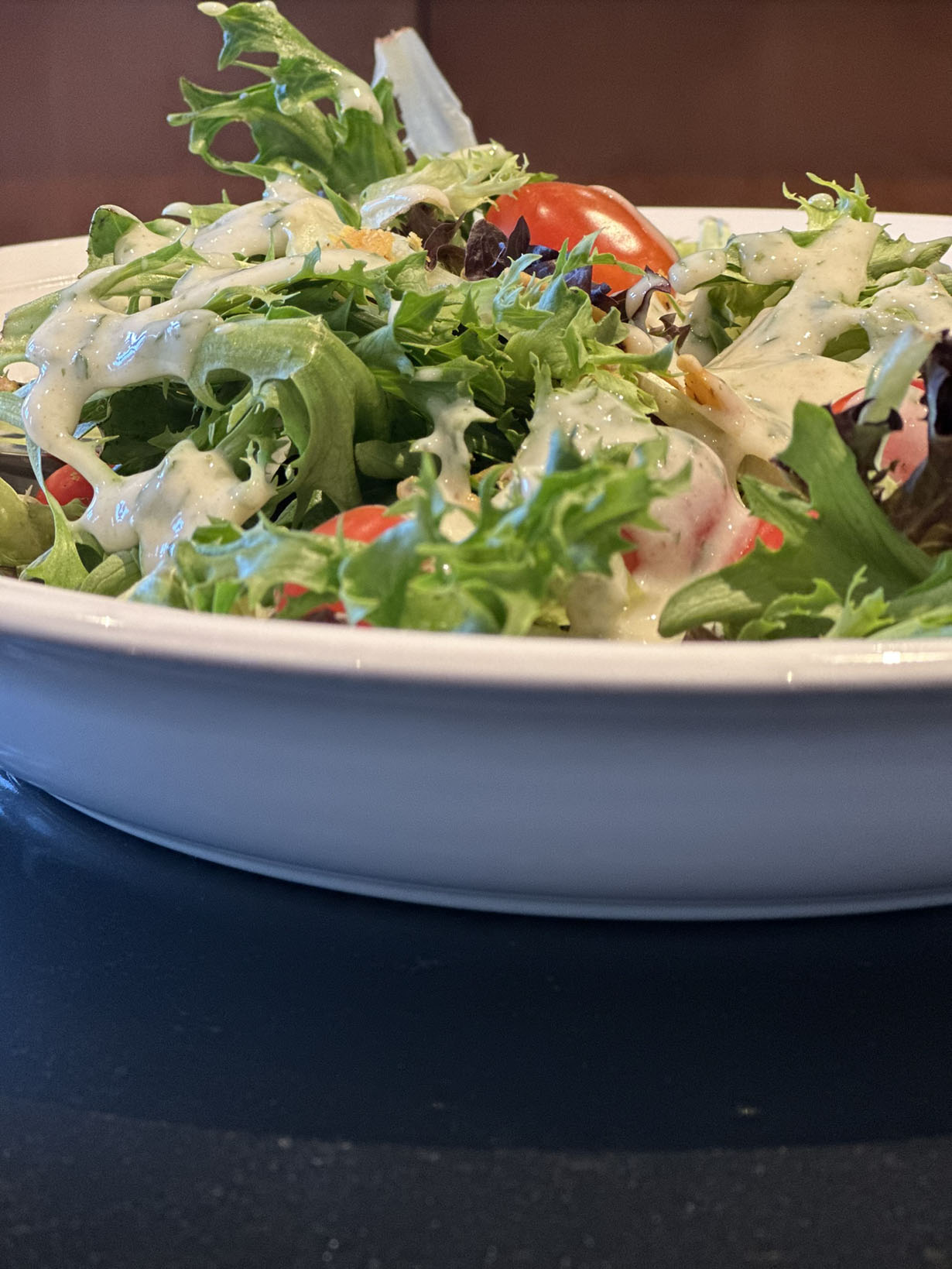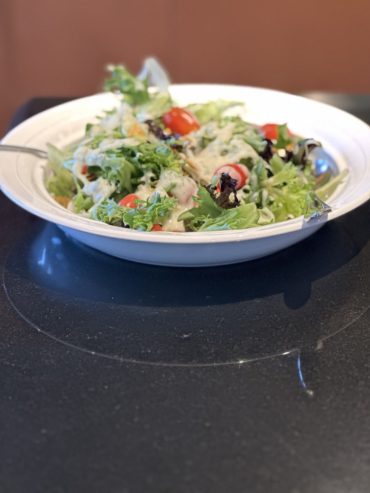 Mix together all the dressing ingredients and stir until well combined. Place a layer of the lettuce in a deep bowl and drizzle with the prepared dressing. Depending on how much dressing you like on your salad, you may have enough for two salads. Top with the cherry tomatoes. Roughly cut the crackers into small pieces by hand and add to the salad.